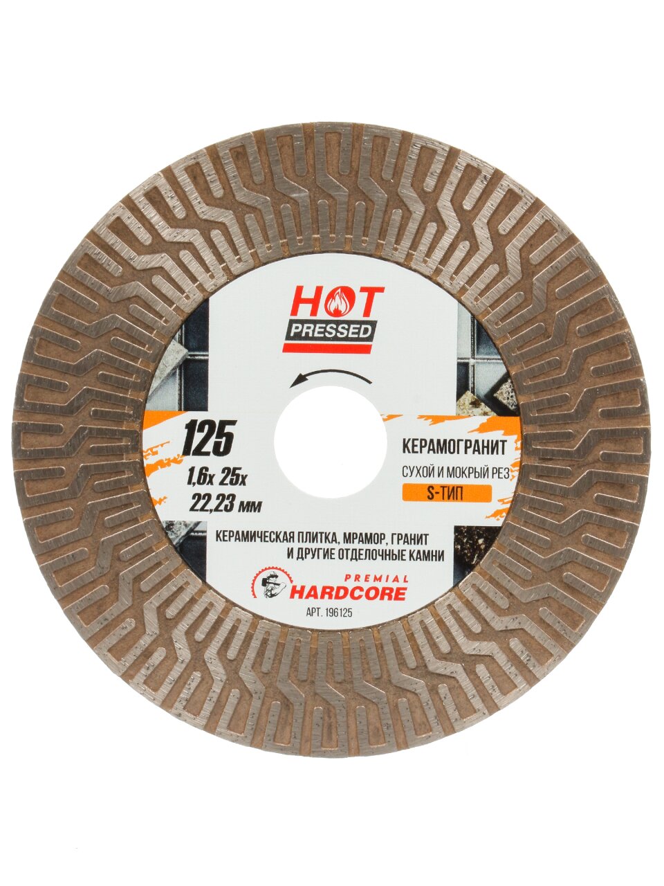 Алмазный диск Hardcore d125х1.6 — выбор профессионалов и домашних мастеров, ценящих точность и ресурс инструмента. Благодаря сегменту 25 мм и типу S, рез получается чистым, с минимальным количеством сколов. Технология Hot pressed обеспечивает равномерное распределение алмазного слоя, что продлевает срок службы и гарантирует стабильную производительность.
