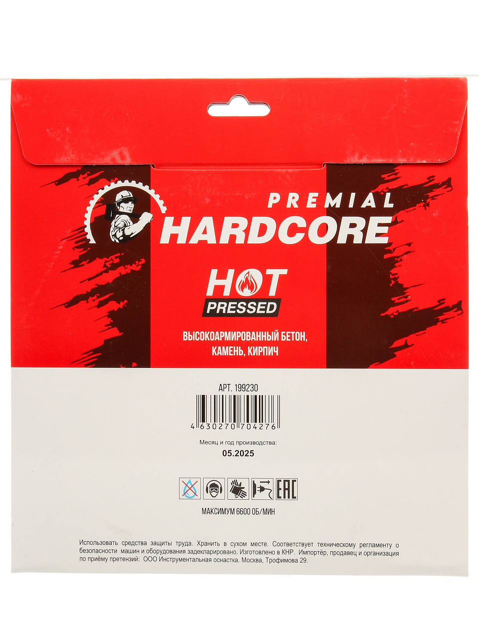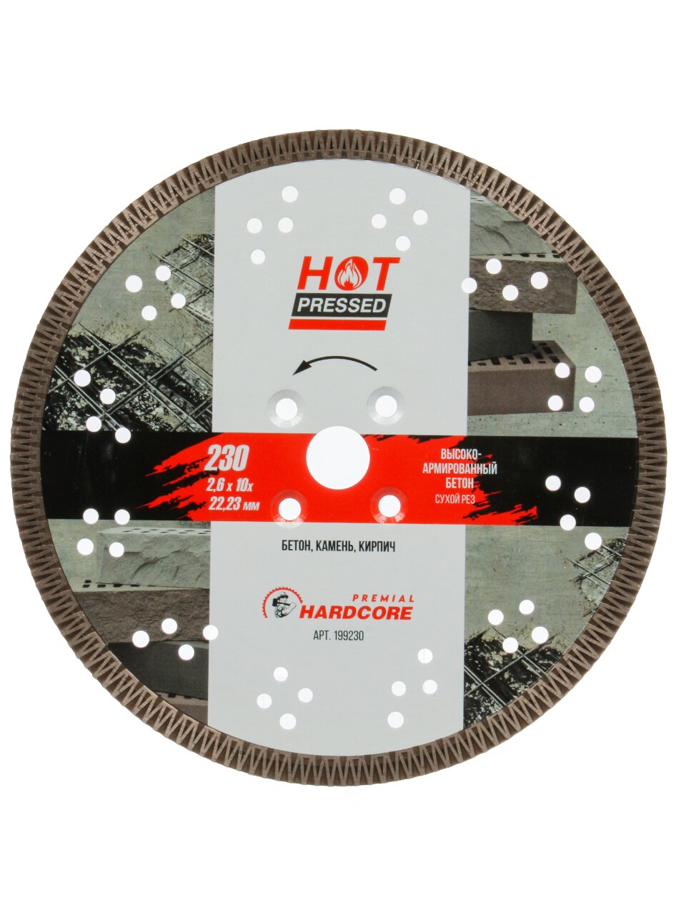 Диск алмазный Hardcore 230x26 мм для резки бетона — быстрый и чистый рез, срок службы до 3 раз дольше, идеальное решение для стройки и ремонта.