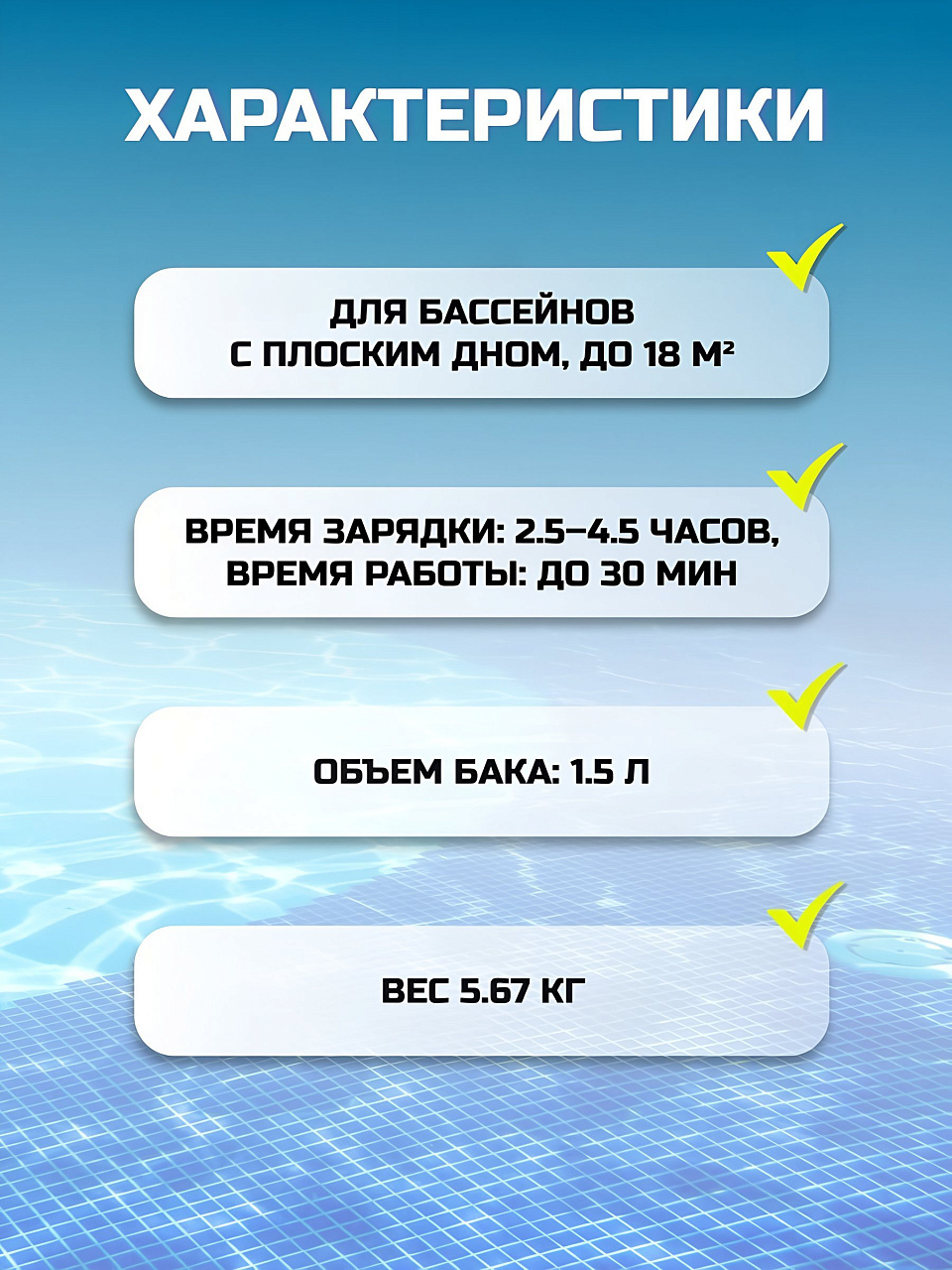 Он работает без проводов, не требует подключения к электросети, легко заряжается через USB и подходит для любых бассейнов с ровным дном площадью до 18 м² — идеален для сезонного использования.