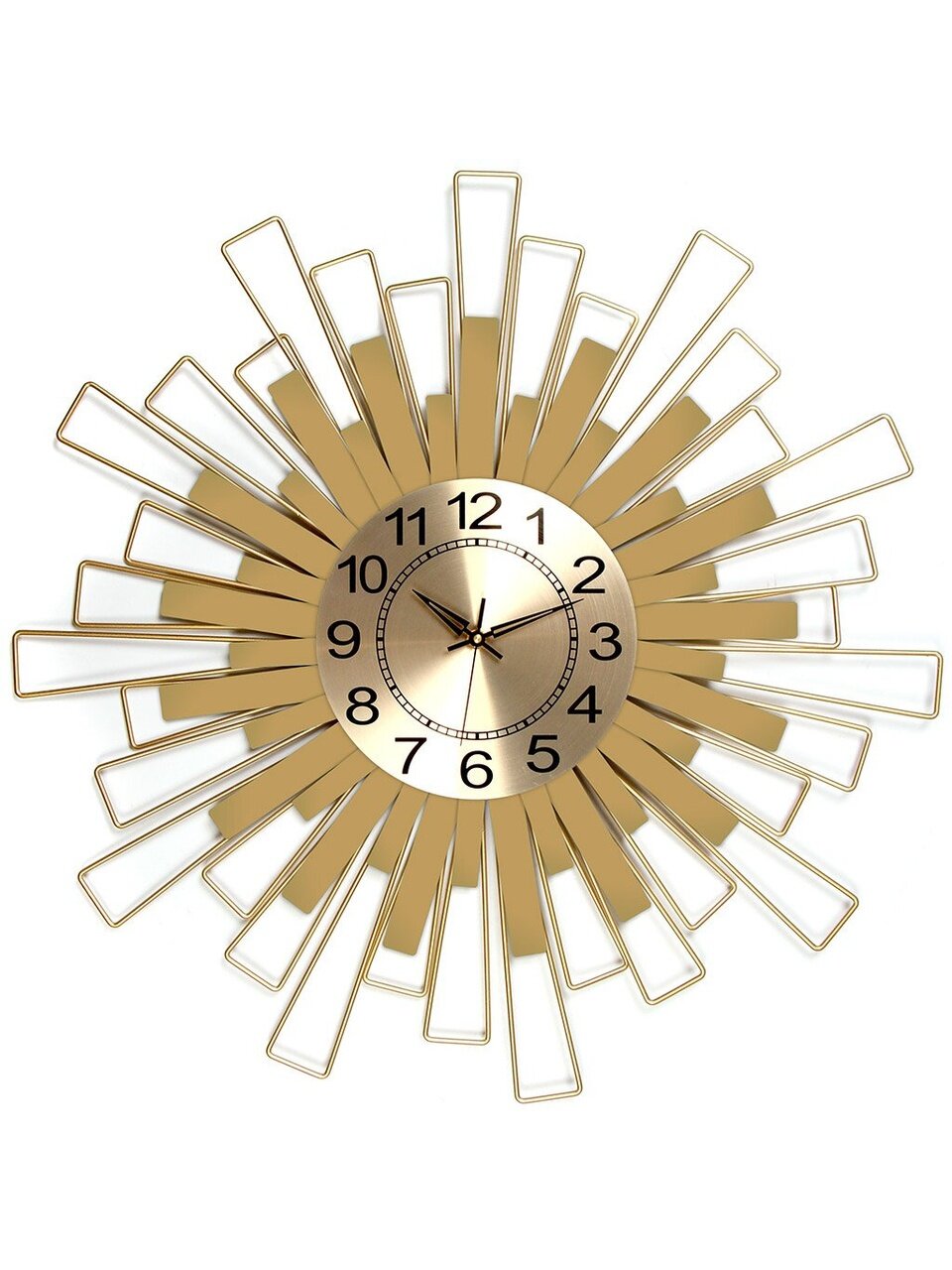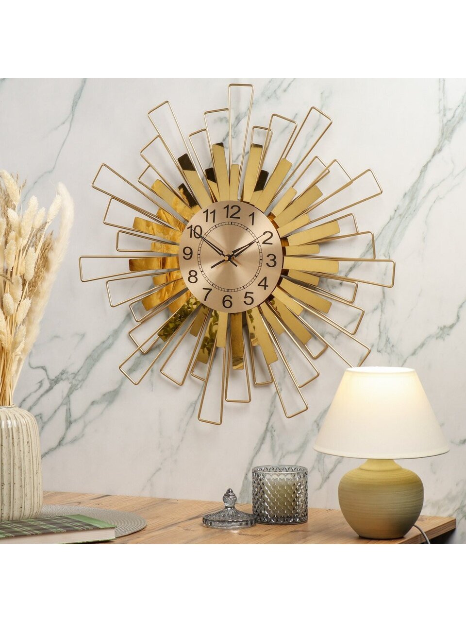 Яркий золотой цвет корпуса привлекает внимание и придает помещению ощущение уюта и тепла. Благодаря кварцевому механизму обеспечивается точный ход и надежность работы, что избавляет от необходимости частой корректировки времени. Диаметр 55 см делает часы заметными даже в просторных комнатах, они становятся центральным акцентом в гостиной, столовой, офисе или на даче. Металлический корпус гарантирует долговечность и устойчивость к механическим воздействиям.