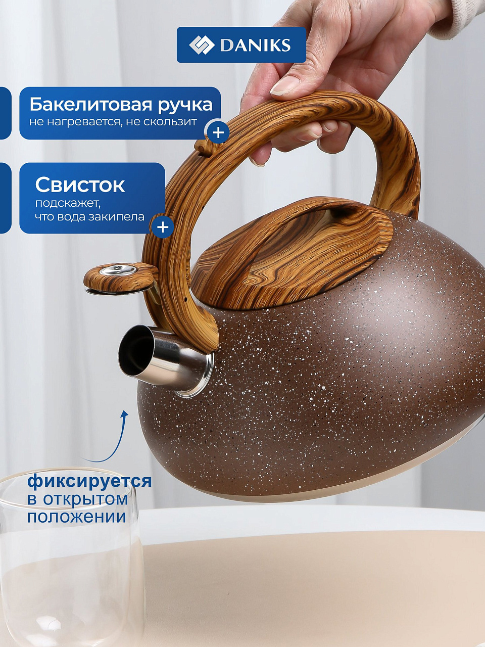 Многие спрашивают, подходит ли этот чайник для индукционной плиты — модель рассчитана на газовые, электрические и стеклокерамические поверхности, но не поддерживает индукцию. В отличие от аналогов с эмалированным покрытием, этот чайник легче и не скалывается при падениях. Бакелитовая ручка не скользит и не нагревается, что особенно важно при частом использовании. Если вы ищете, что лучше для дачи или подарка — универсальный дизайн и надёжность Daniks делают его практичным выбором.