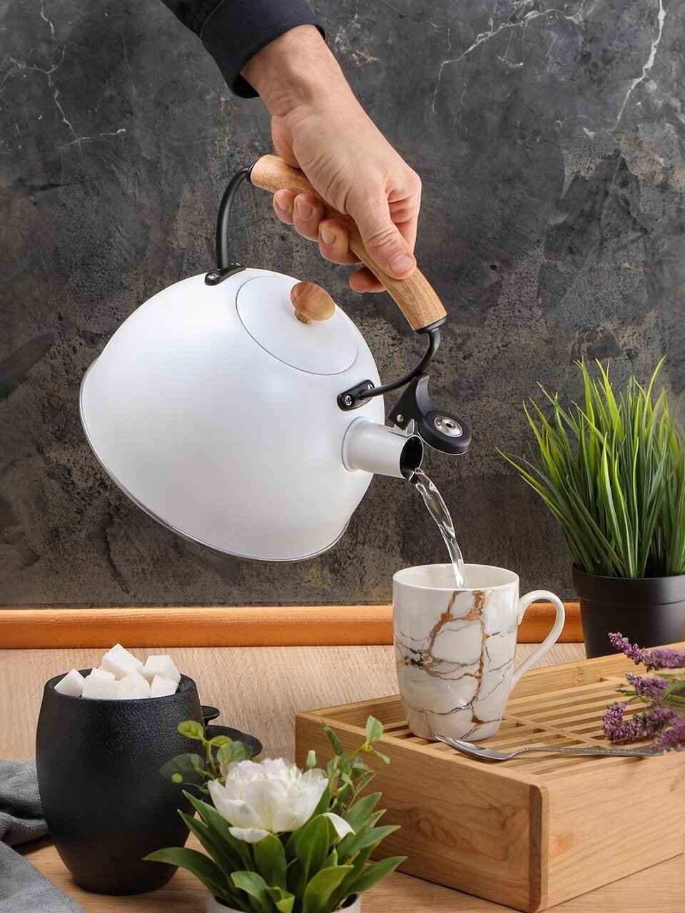 Чайник из нержавеющей стали Daniks объёмом 2.5 литра — это удачный выбор для тех, кто ищет недорогой, но долговечный чайник для индукционной плиты или других типов варочных поверхностей. Матовый корпус не только выглядит современно, но и устойчив к царапинам, а многослойное дно обеспечивает быстрый нагрев и экономию времени. Если вы ищете, какой чайник выбрать для дачи или квартиры, обратите внимание на сочетание натуральной деревянной ручки и белого цвета — такой чайник легко впишется в скандинавский или минималистичный интерьер.