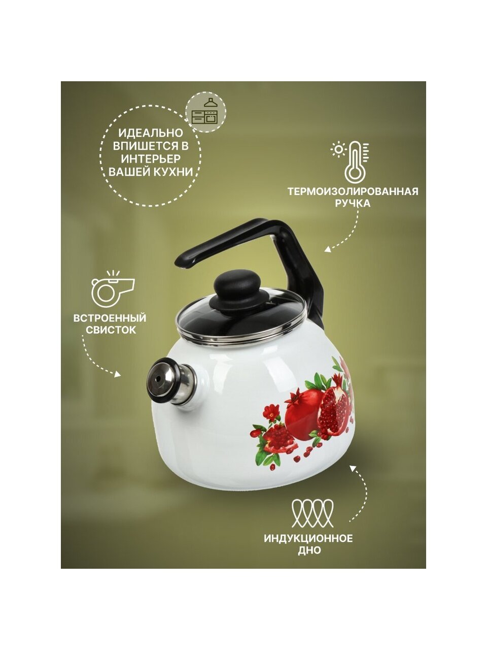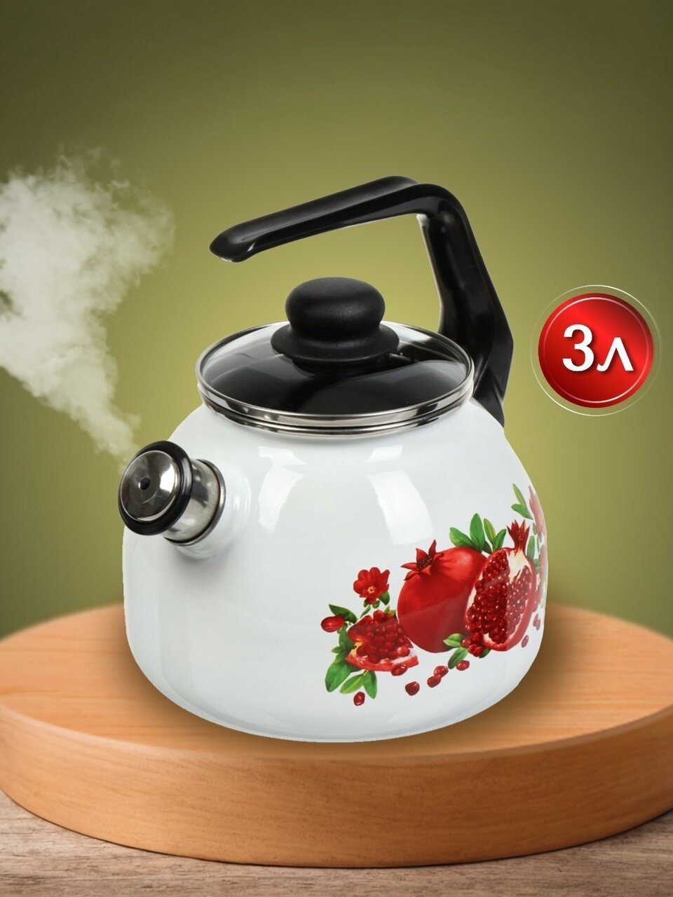 Чайник из стали с эмалированным покрытием «Гранатовый сок» — оптимальный выбор, если вы ищете, какой чайник купить недорого для дачи или кухни. Объём 3 литра позволяет быстро вскипятить воду на большую компанию, а свисток предупредит о закипании. Благодаря эмалированию корпус не подвержен коррозии, легко очищается от накипи и не впитывает запахи. Термоизолированная пластиковая ручка защищает от ожогов, а стильный белый цвет с декором впишется в любой интерьер.