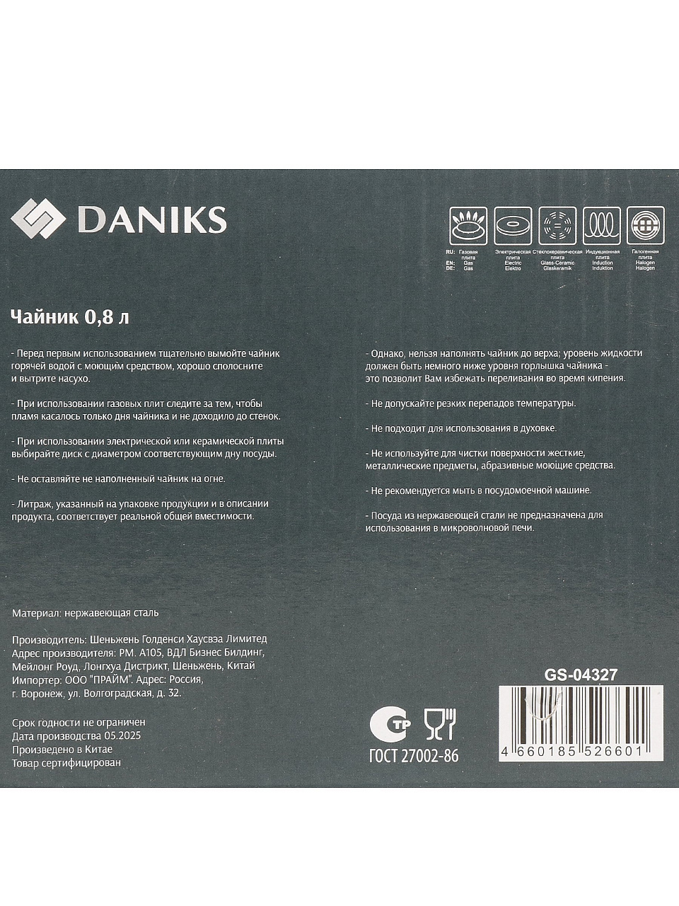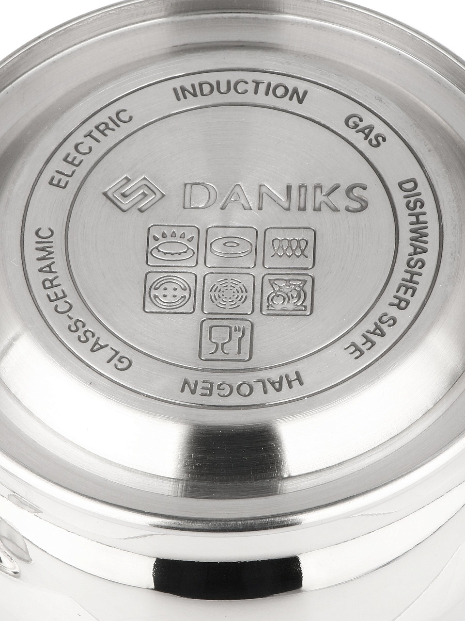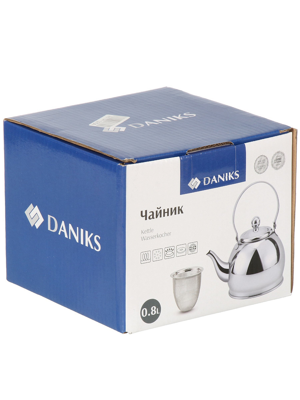Чайник из нержавеющей стали Daniks 0.8 л — компактное решение для дома и дачи: зеркальная полировка, ситечко в комплекте, подходит для индукции и посудомоечной машины.