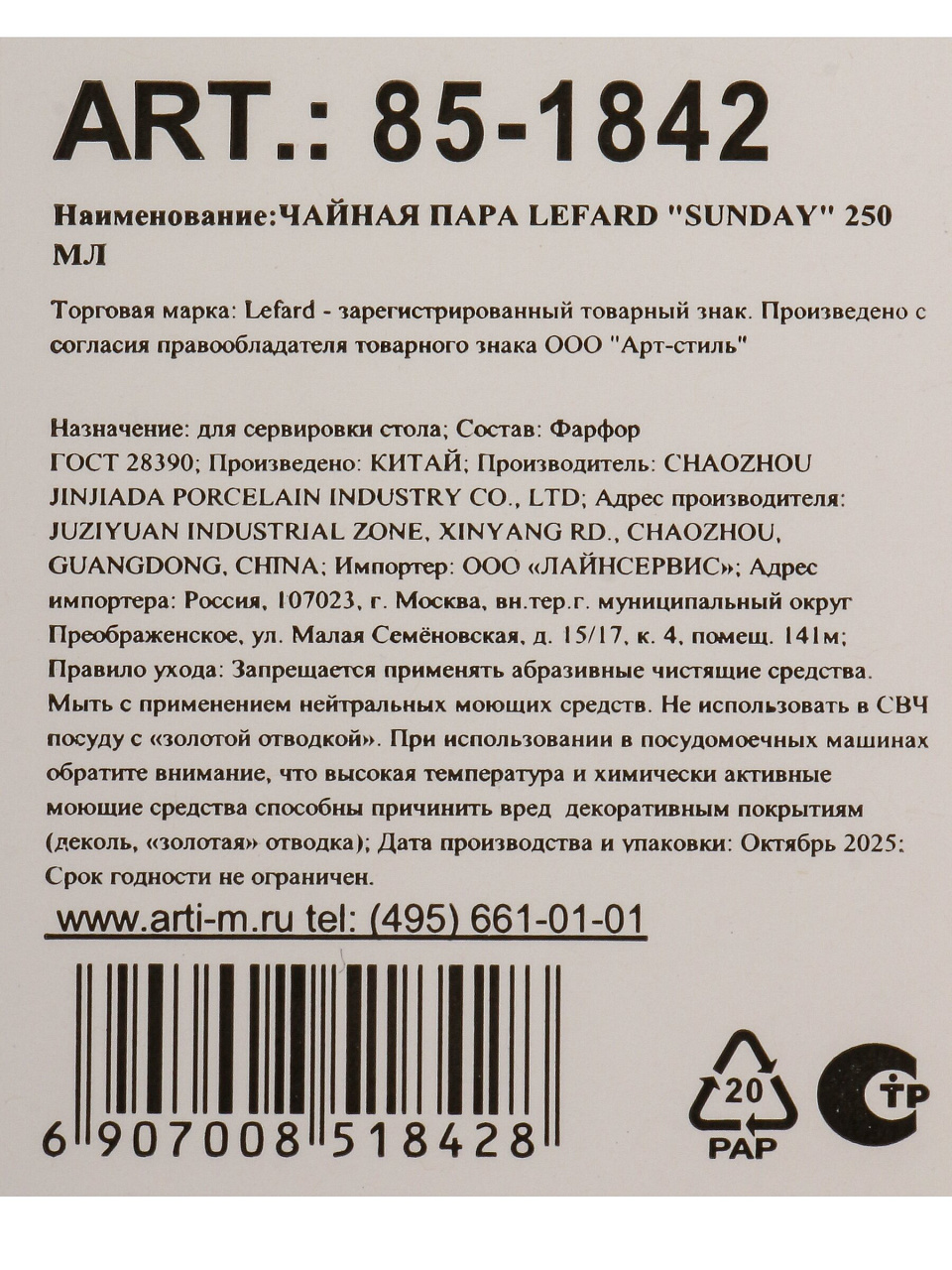 Чайная пара фарфор, 2 предмета, на 1 персону, 250 мл, Lefard, Sunday, 85-1842, подарочная упаковка - фото 1 от пользователяЧайная пара фарфор, 2 предмета, на 1 персону, 250 мл, Lefard, Sunday, 85-1842, подарочная упаковка - фото 2 от пользователяЧайная пара фарфор, 2 предмета, на 1 персону, 250 мл, Lefard, Sunday, 85-1842, подарочная упаковка - фото 3 от пользователя