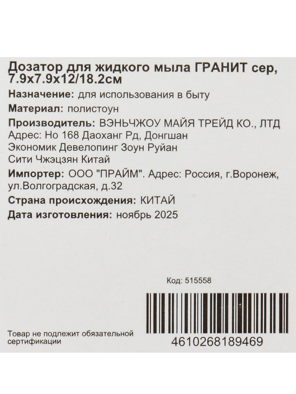 Дозатор изготовлен из полистоуна — это прочный композит, устойчивый к влаге и механическим повреждениям, не впитывает запахи.