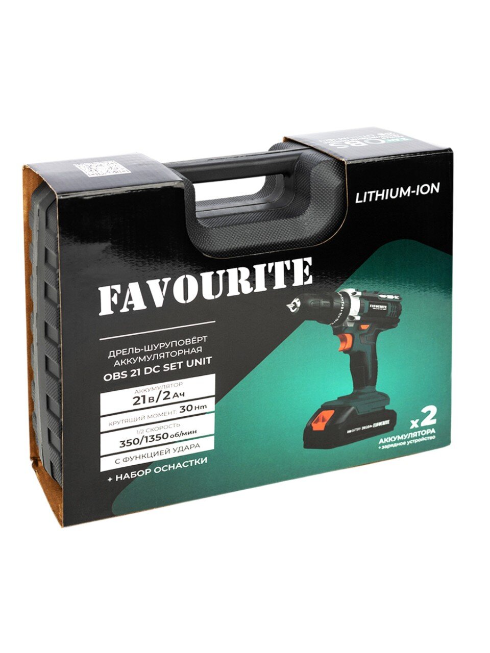 Дрель-шуруповерт аккумуляторный Favourite OBS 21 DC SET UNIT 21В — универсальный инструмент с ударным режимом, двумя Li-ion аккумуляторами и кейсом для хранения. Решение для ремонта, дачи и сборки мебели.