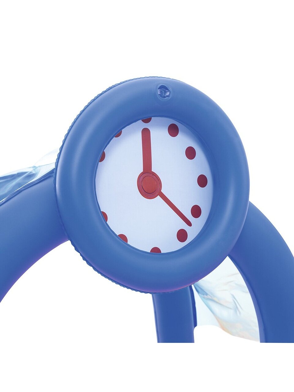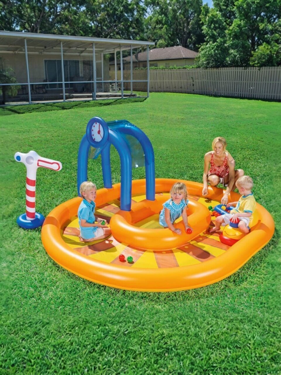 Поставьте на участке неглубокий бассейн для самых маленьких деток. Если его не наполнять водой, можно поиграть в железную дорогу и покататься на паровозике. В арке с табло сделан распылитель, который спасёт от летнего зноя. Жарким днём такой комплекс соберёт ребят всех возрастов.