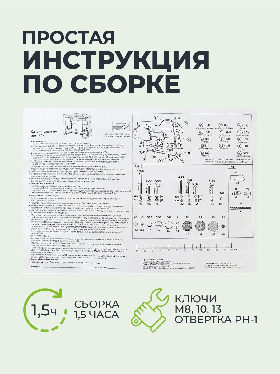 Эти качели выполнены в стильном зеленом цвете, который гармонично впишется в любой ландшафт. В комплект также входят подушки и матрас, обеспечивающие дополнительный комфорт. Подстаканники и тент делают пребывание на свежем воздухе еще более приятным, позволяя насладиться напитками и защитой от солнца.