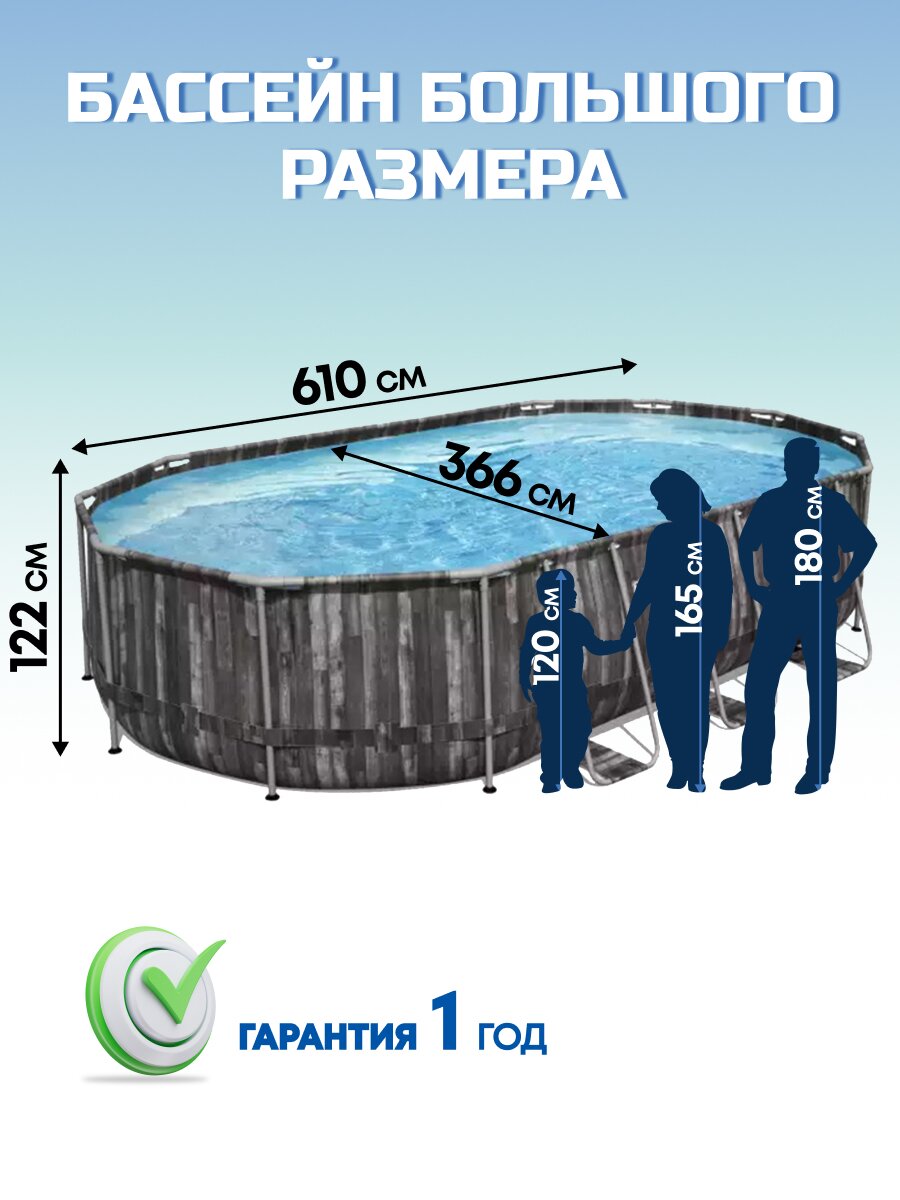 Погрузитесь в мир комфорта и наслаждения с каркасным бассейном Bestway Power Steel Oval Pool. Этот великолепный бассейн станет идеальным дополнением для дачи, превращая отдых на свежем воздухе в настоящее удовольствие. С его внушительными размерами 610х366х122 см и объемом 20241 литр, он предоставляет достаточно пространства для всей семьи и друзей. Овальная форма бассейна в сочетании с имитацией дерева темно-серого цвета добавляет элегантности и стиля вашему участку.
