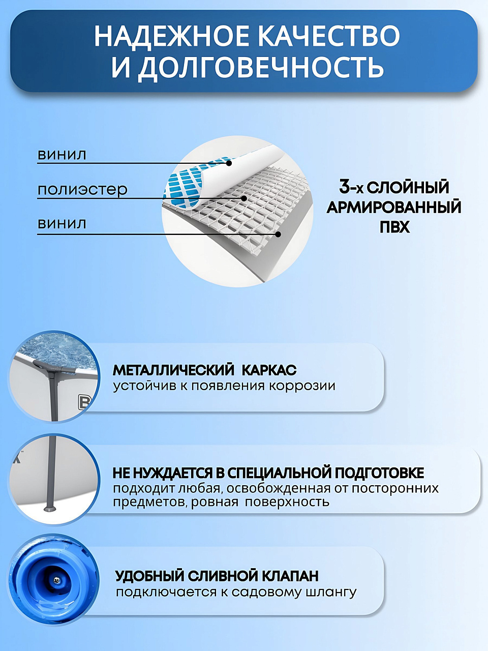 - Прочность и надежность: трехслойный ПВХ и стальной каркас.