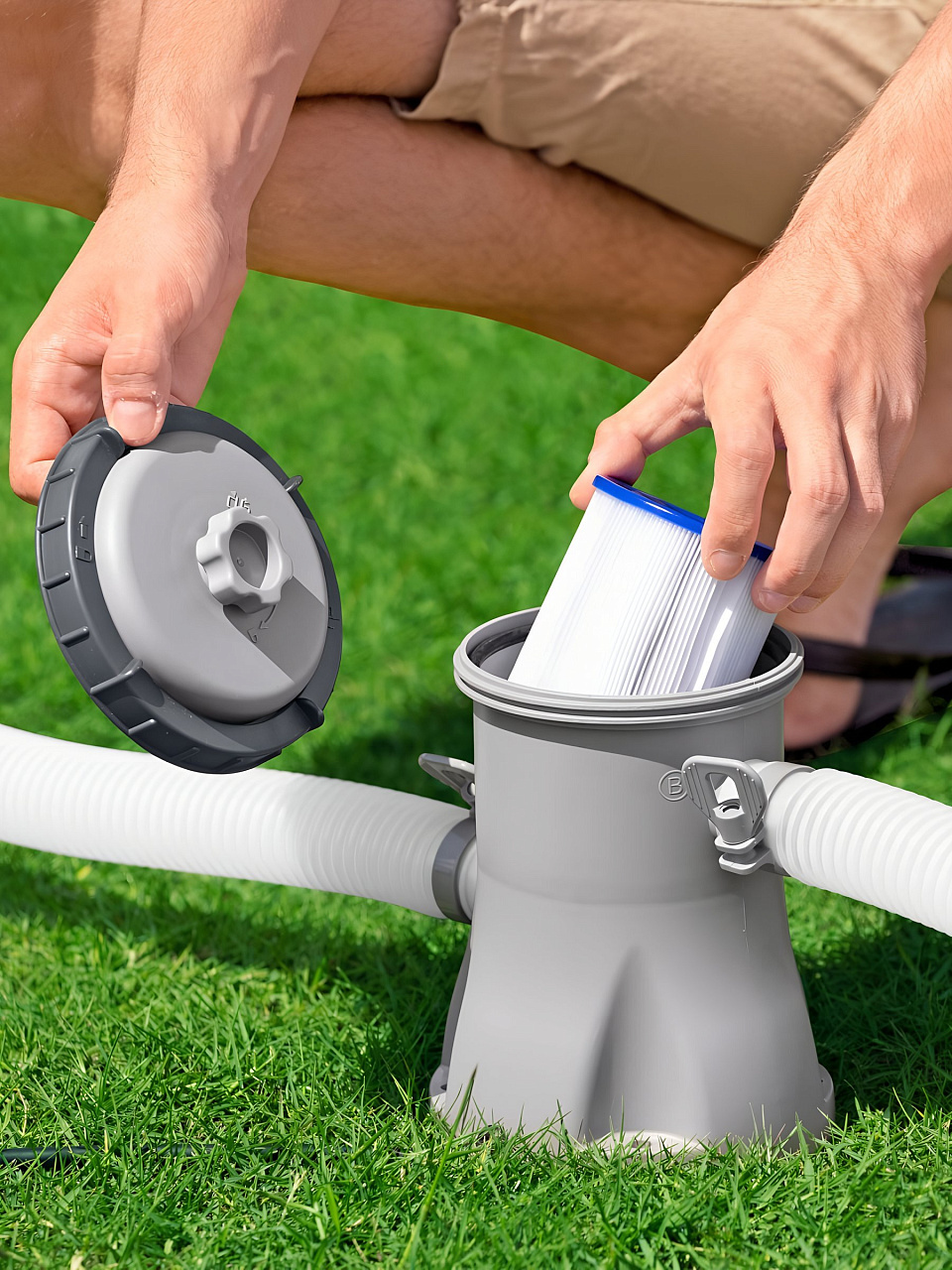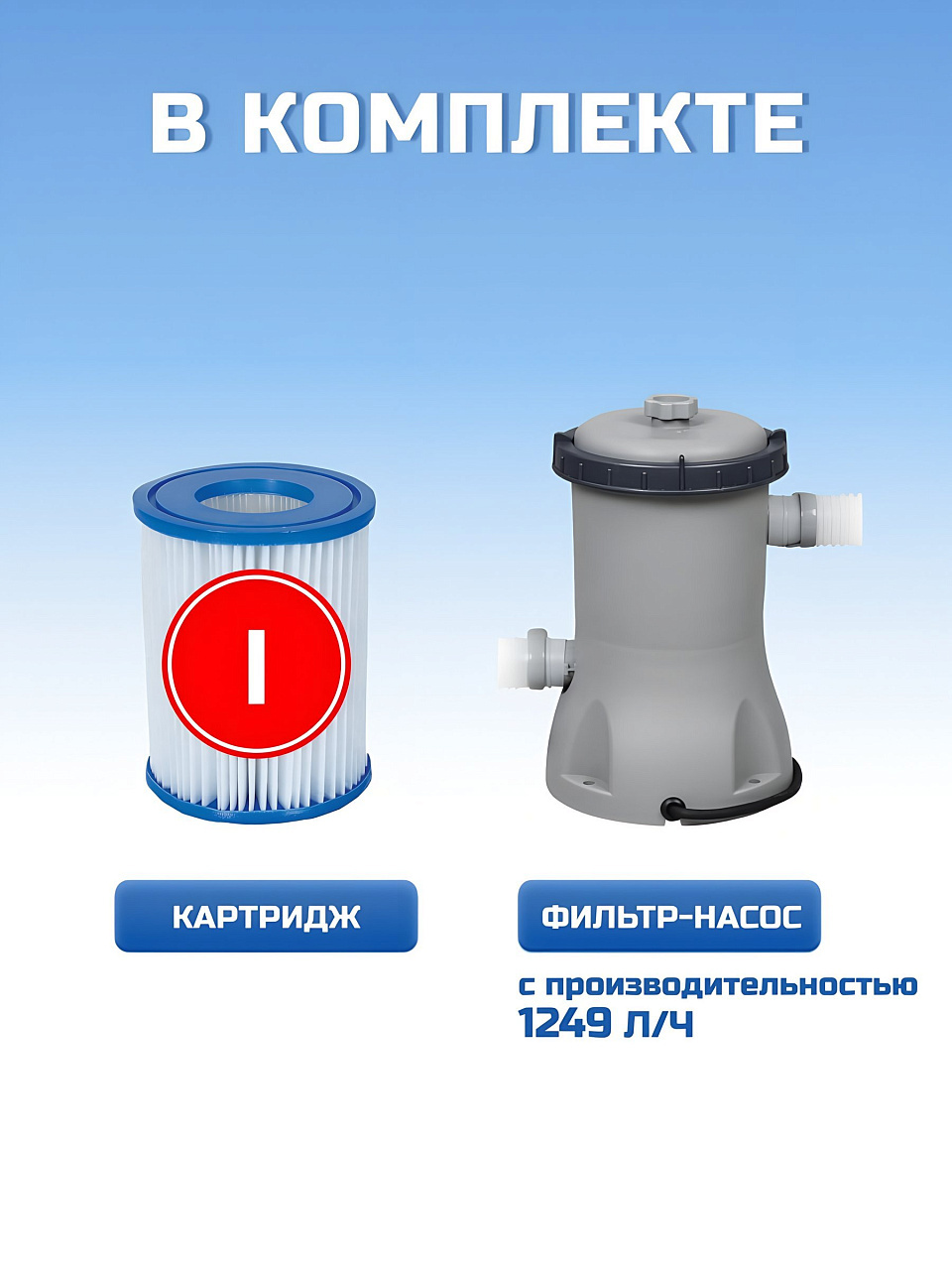 Комплектация: каркас - 1 шт; чаша бассейна - 1 шт; фильтрационный насос - 1 шт; картридж (тип I) - 1 шт; шланги и хомуты для подключения фильтр-насоса - 1 комплект; ремкомплект -1 шт; инструкция - 1 шт.