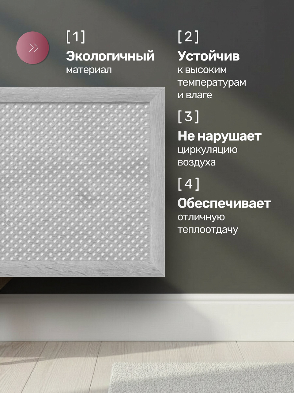 Декоративный экран изготовлен из МДФ, который не содержит вредных для здоровья веществ. Это особенно важно для людей с аллергией или семей с маленькими детьми. Обладает высокой устойчивостью к механическим повреждениям, влаге и высоким температурам, что обеспечивает его долговечность.