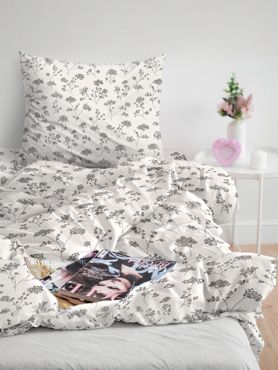 Если вы ищете, какое постельное белье лучше для подарка, обратите внимание на этот комплект: он идет в подарочной упаковке и универсален по дизайну. Подходит для подростков и взрослых, легко сочетается с интерьером благодаря белому цвету и цветочному принту. Нет простыни на резинке — удобно для классических матрасов.
