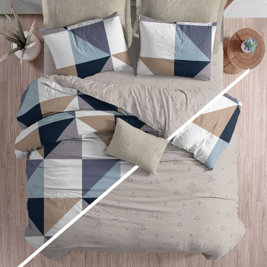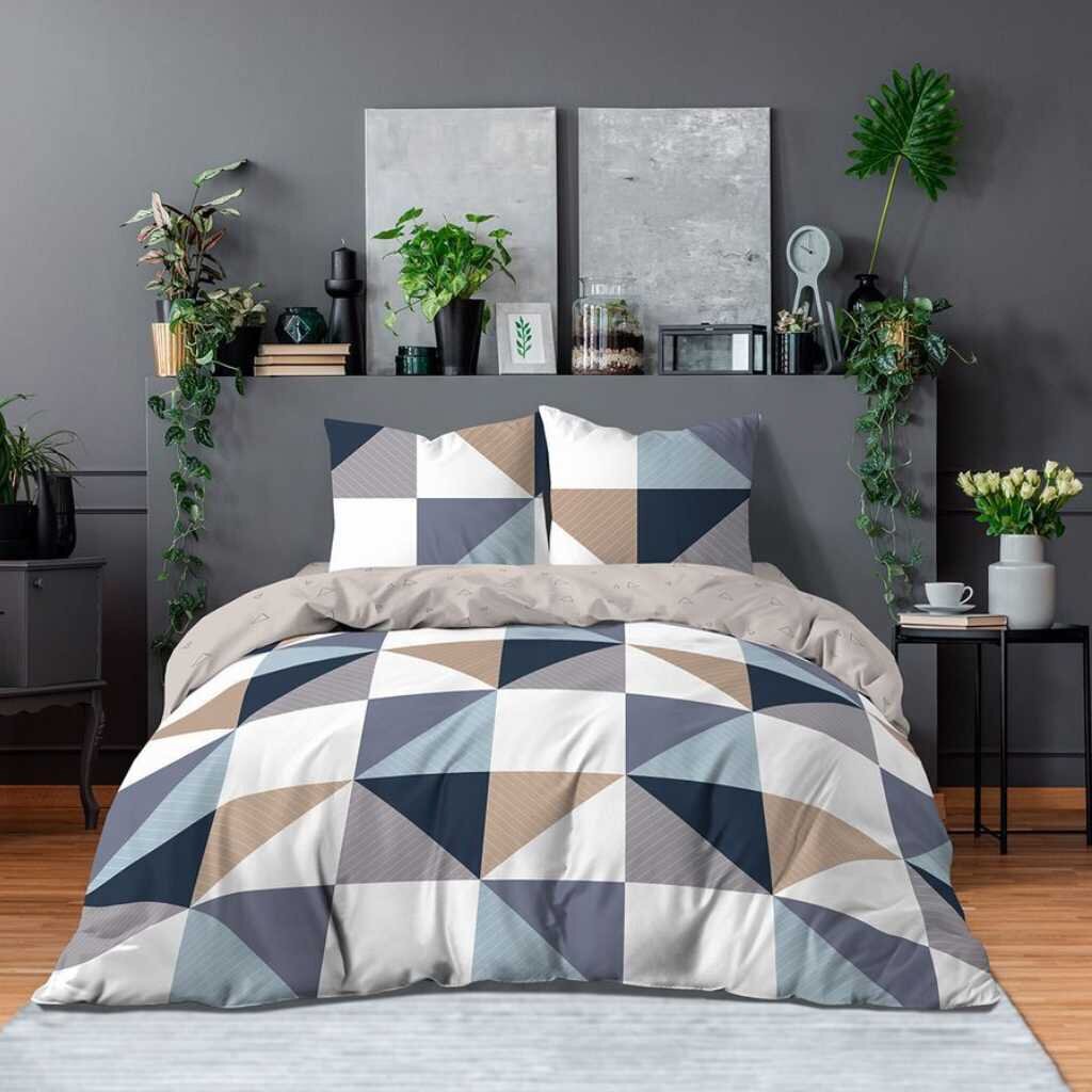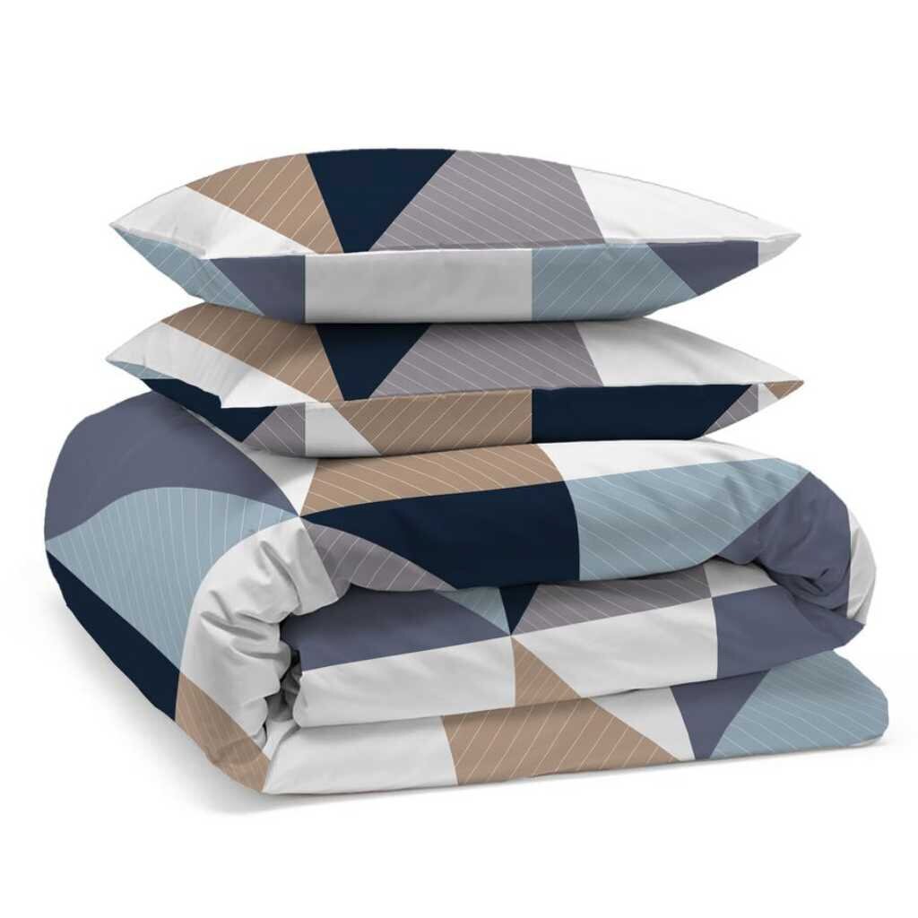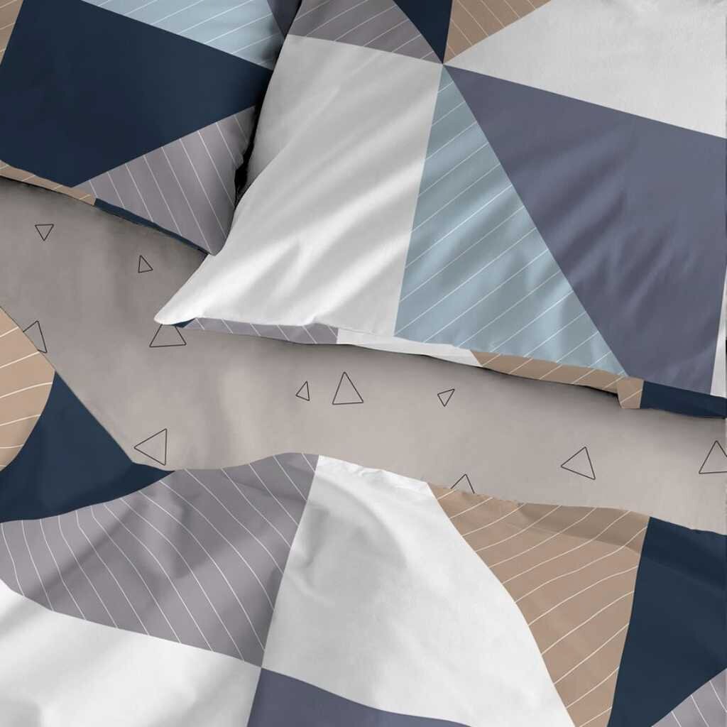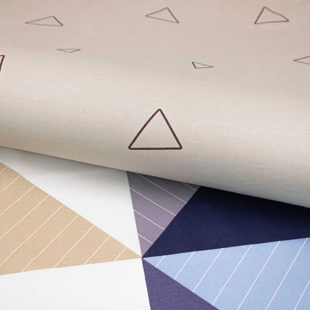 - Уникальный дизайн: геометрический принт на синем поплине — современное решение для спальни.
