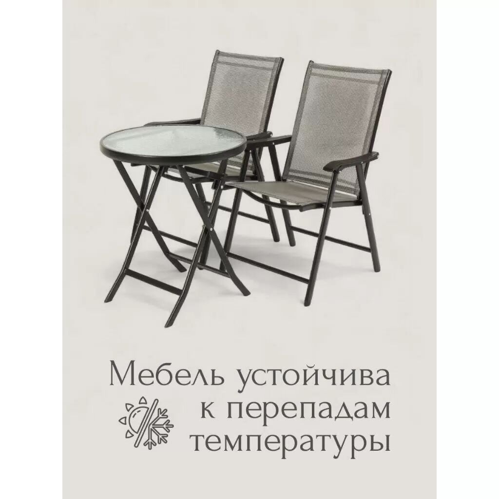 Мебель предназначена для комфортного отдыха на свежем воздухе и прекрасно подойдет для двоих персон. Складная конструкция обеспечивает легкость хранения и транспортировки, что особенно удобно для сезонного использования. Стеклянная столешница придает комплекту легкость и визуальную невесомость, а металлический каркас гарантирует долговечность и устойчивость к ежедневной эксплуатации. Отсутствие подушек делает уход за мебелью простым и быстрым — достаточно протереть поверхности влажной салфеткой.