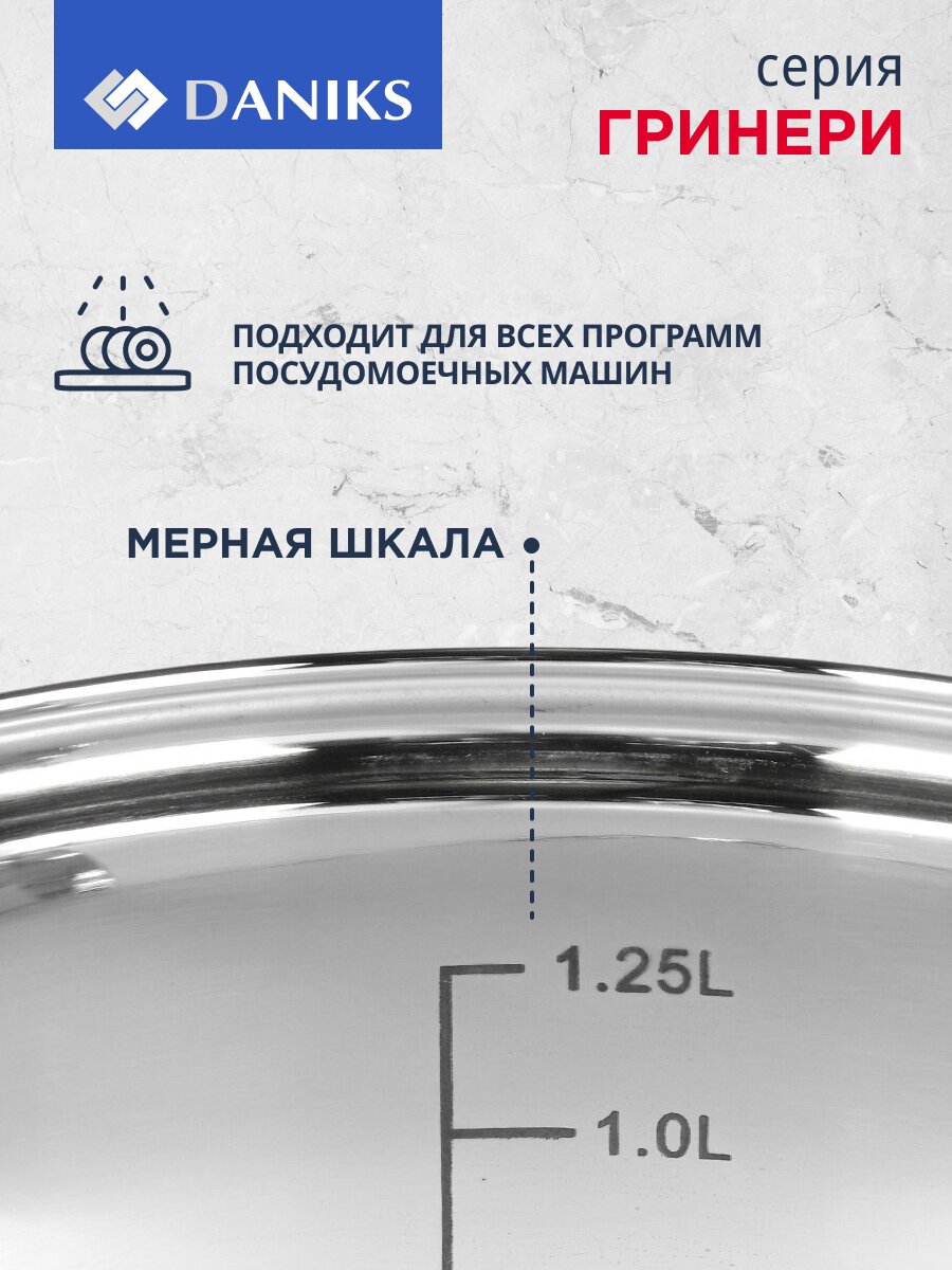 Ковш Daniks Гринери 1.7 л: нержавеющая сталь, стеклянная крышка, силиконовая ручка, подходит для индукции — идеальный выбор для кухни и дачи.