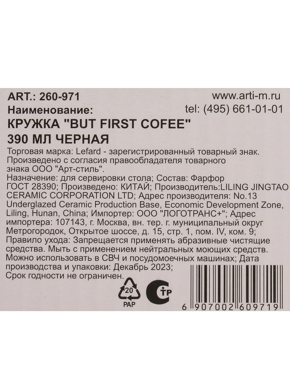 Вы можете приобрести «Кружка фарфор, 390 мл, But First Coffee, Lefard, 260-971, черная» и другие товары в нашем интернет-магазине в Ярославле по низким ценам и с бесплатным самовывозом.