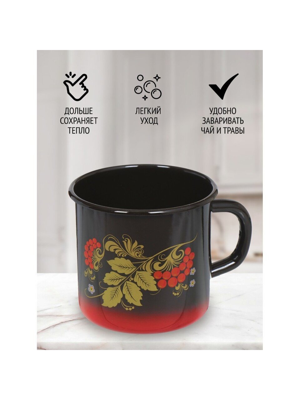 Если вы ищете, какую кружку выбрать для дачи или похода, обратите внимание на эмалированную стальную кружку «Сибирские товары» объемом 1 литр. Благодаря прочному стальному корпусу и эмалированному покрытию, эта кружка устойчива к царапинам, не впитывает запахи и легко моется даже в посудомоечной машине. Красно-черный дизайн с мотивами листьев и ягод отлично впишется в современный интерьер или станет ярким акцентом на пикнике.