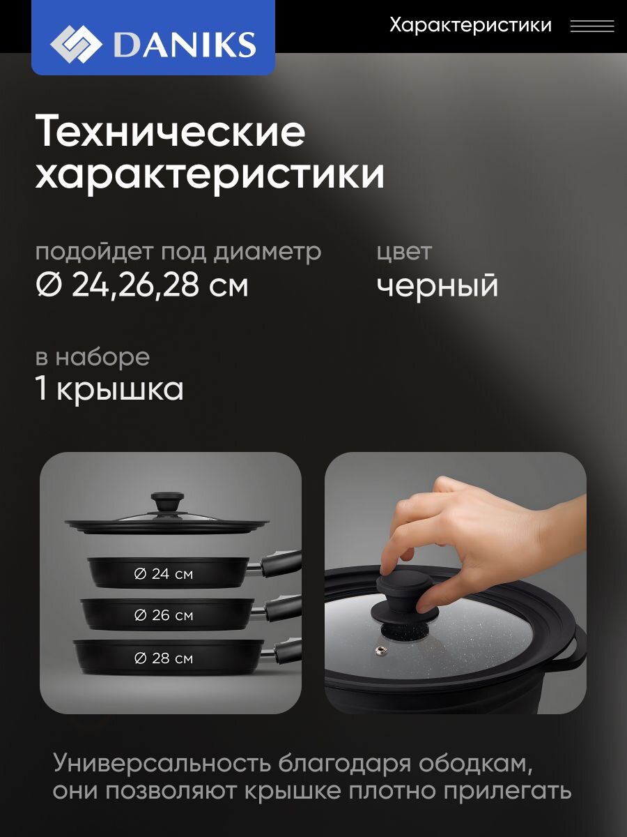 Вы можете приобрести «Крышка для посуды стекло, Daniks, кнопка силикон, черная, 24/26/28 см, GLM-242628» и другие товары в нашем интернет-магазине в Борисоглебске по низким ценам и с бесплатным самовывозом.