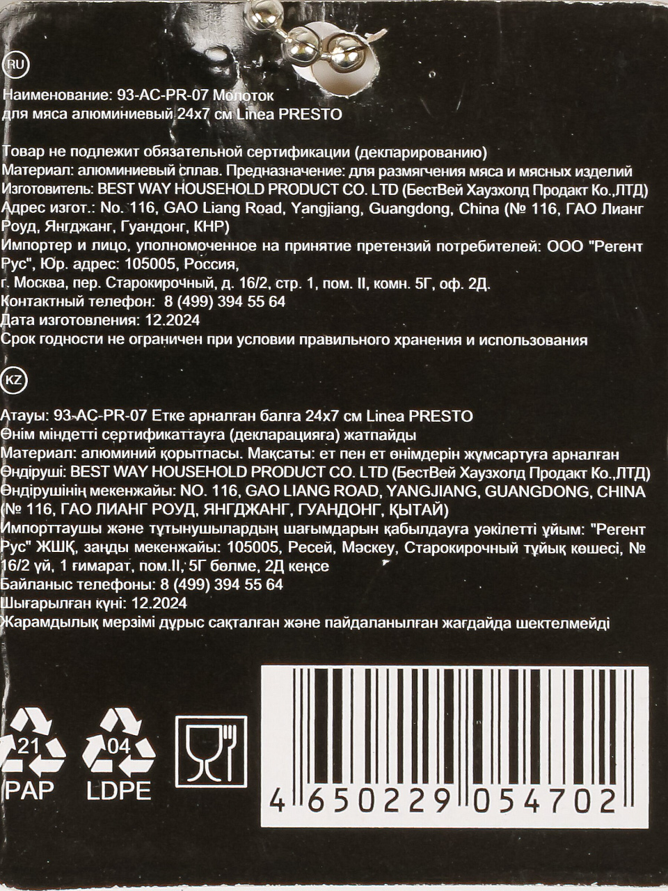 Вы можете приобрести «Молоток для мяса, алюминий, 24х7 см, навеска, Regent Inox, Linea Presto, 93-AC-PR-07» и другие товары в нашем интернет-магазине в Нижнем Новгороде по низким ценам и с бесплатным самовывозом.