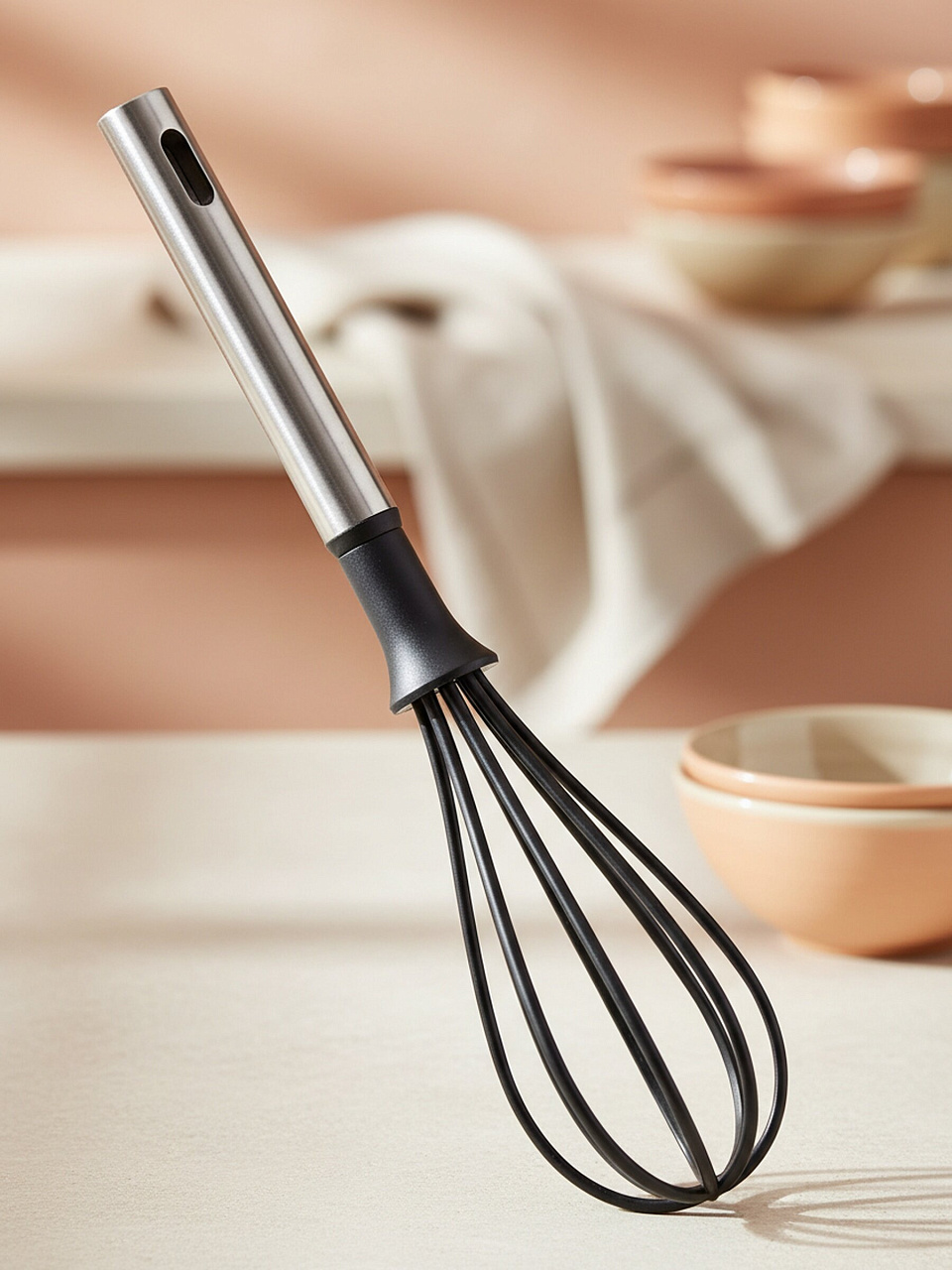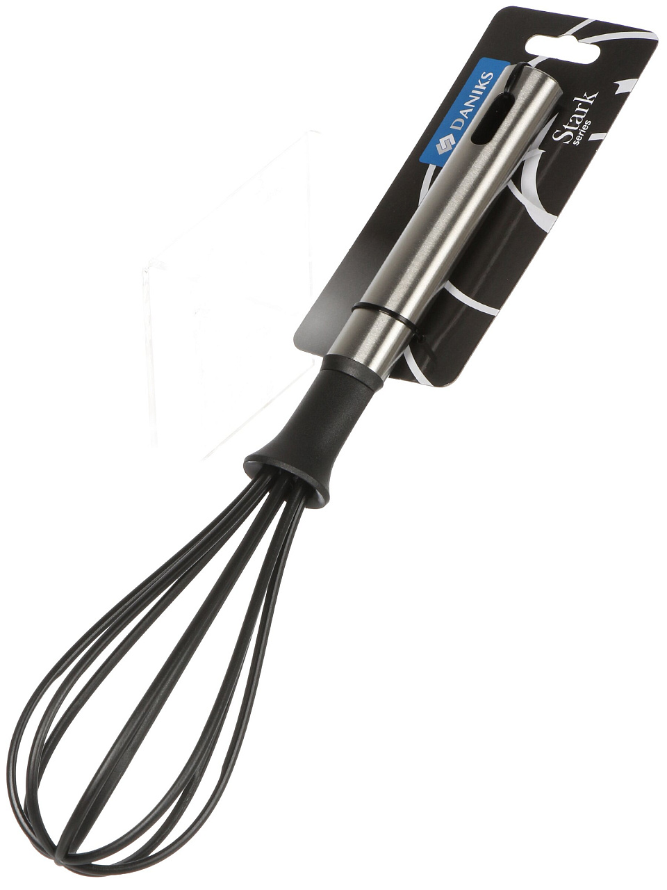 Венчик Daniks Stark — это современное решение для тех, кто ищет, какой венчик выбрать для антипригарной посуды. Благодаря нейлоновым пруткам и хромированной рукоятке, инструмент не повреждает деликатные покрытия и устойчив к частому мытью, включая посудомоечную машину. Легко подвешивается на рейлинг, экономит место и всегда под рукой.