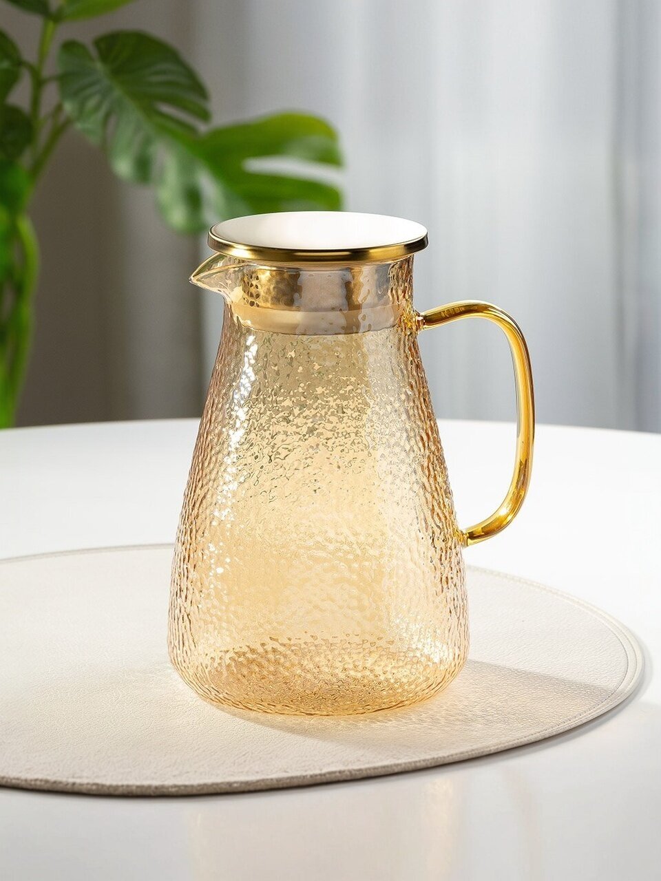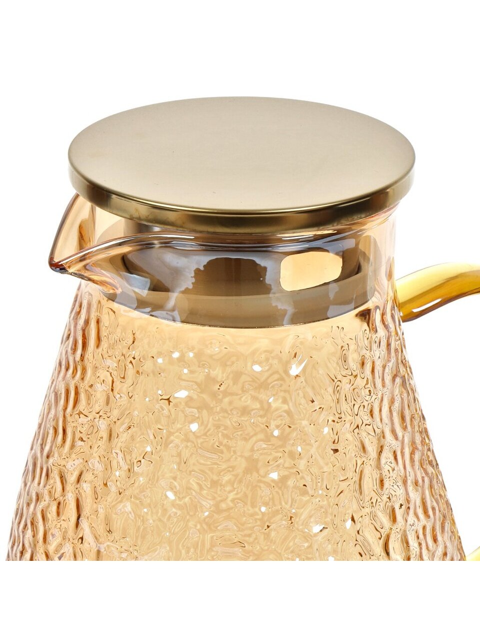 Стеклянный кувшин - полезный кухонный атрибут, который можно использовать в качестве ёмкости для Ваших любимых напитков. Данная модель кувшина изготовлена из стекла и выполнена в нежном золотисто-медовом цвете. Кувшин закрывается с помощью крышки, которая сохранит аромат и вкус Вашего напитка насыщенным. Станет прекрасным дополнением на Вашем повседневном, или праздничном столе, а также хорошим вариантом для подарка. Выполнен из термостойкого стекла и подходят для горячих напитков (чая/кофе).