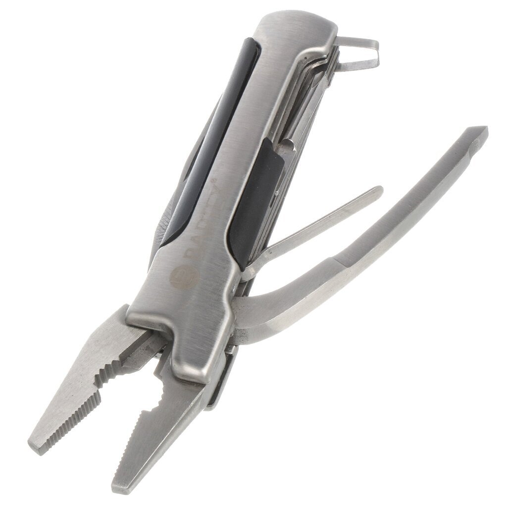 - Опции: щипцы длинные, плоскогубцы, захват круглых предметов, кусачки, нож, пила по дереву, напильник, открывалка, плоская отвертка, крестовая отвертка.