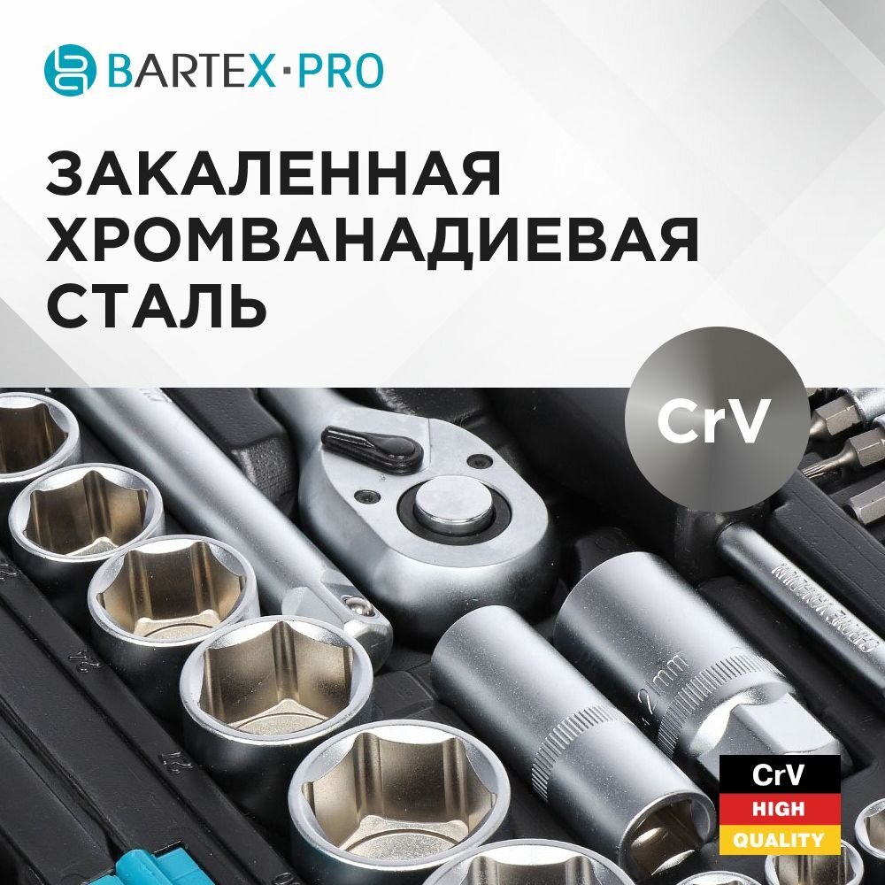 Набор инструментов Bartex выполнен из высококачественной хромованадиевой стали. Сильными сторонами этого материала являются высокая стойкость к ударным нагрузкам и коррозии. Инструменты помещены в прочный и стильный кейс, который удобно брать с собой.
