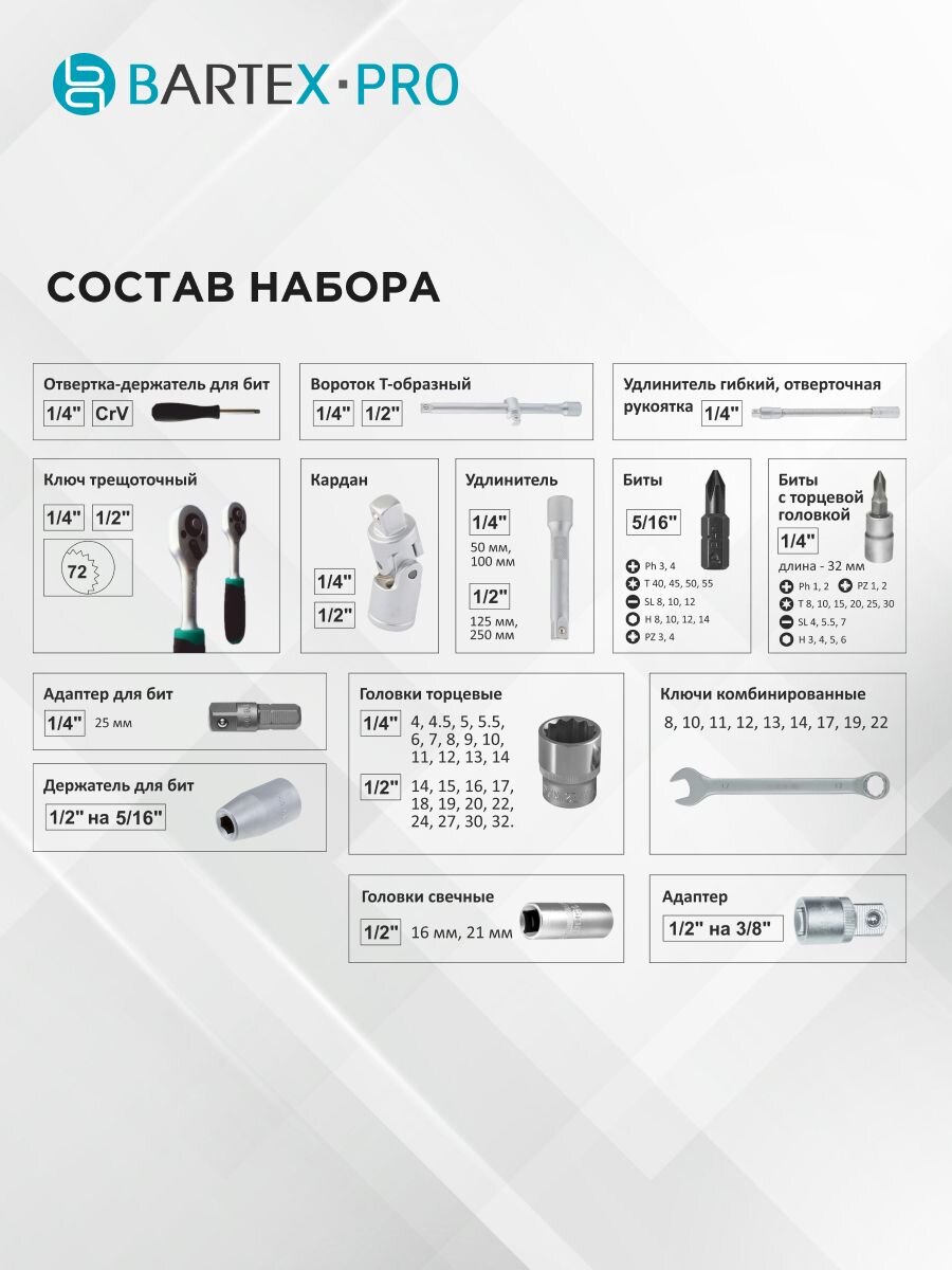 Вы можете приобрести «Набор слесарных инструментов Bartex, 1/2", 1/4", 6-гранный, сталь, кейс, 82 предмета» и другие товары в нашем интернет-магазине в Астрахани по низким ценам и с бесплатным самовывозом.