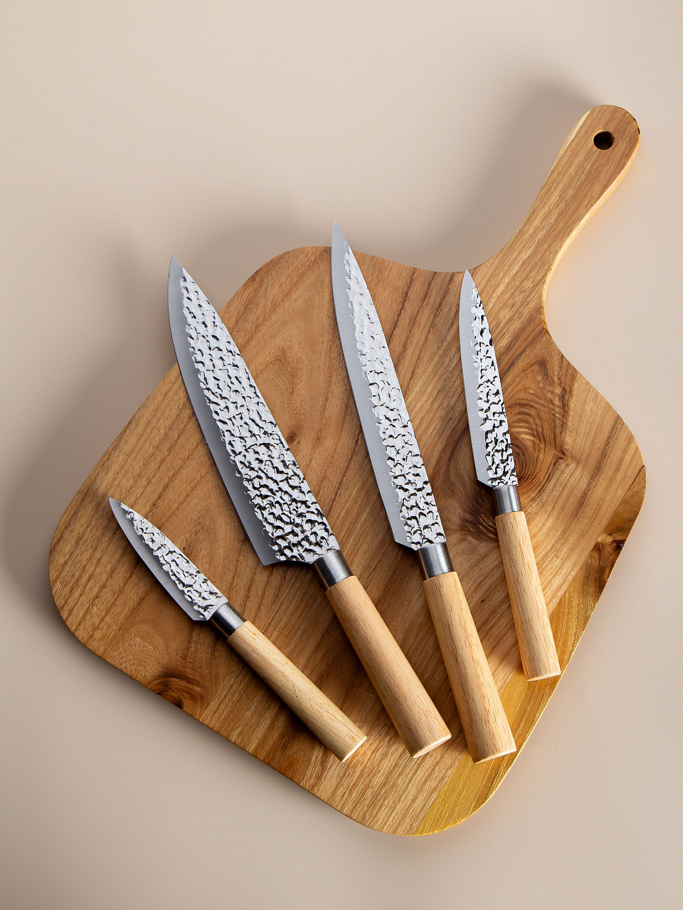Лезвия изготовлены из прочной нержавеющей стали, что гарантирует долговечность и устойчивость к коррозии. Деревянные рукоятки обеспечивают комфортный и надёжный захват, предотвращая скольжение даже при длительной работе. Подставка из прозрачного акрила не только сохраняет порядок на кухне, но и позволяет удобно хранить ножи, всегда держа их под рукой.