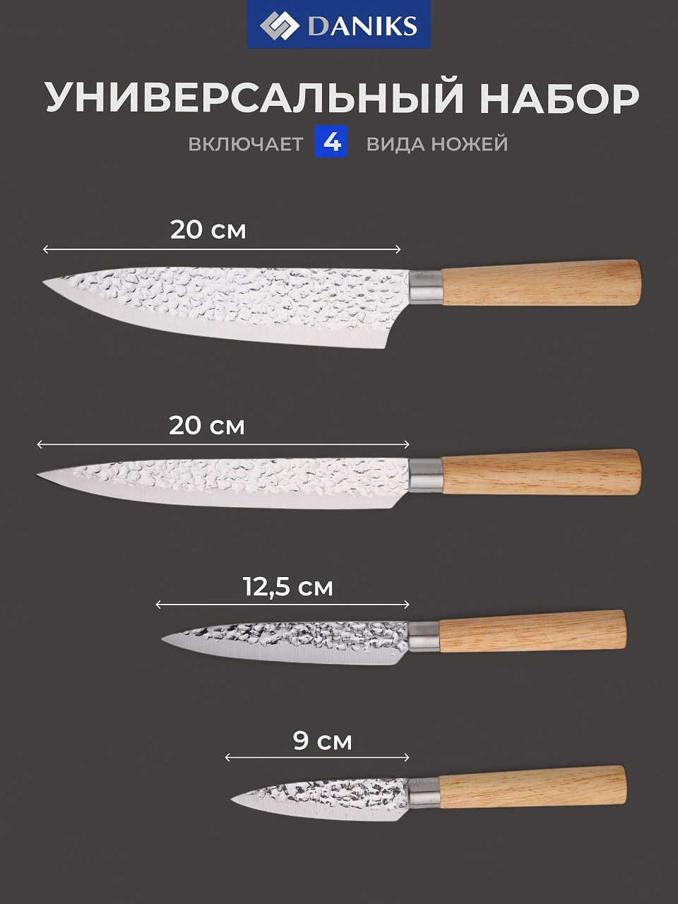 Изделие от бренда Daniks из коллекции Вуд Грейс отличается высоким качеством исполнения и продуманной эргономикой. Максимальная длина лезвия составляет 20 см, минимальная — 9 см, что позволяет легко справляться с различными задачами: от разделки мяса до нарезки овощей и фруктов.