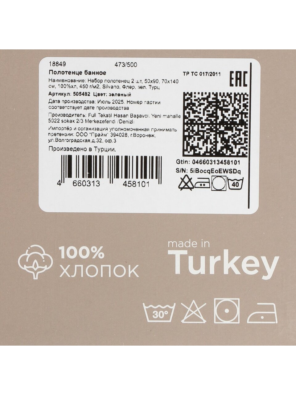 В наборе используются полотенца из 100% натурального хлопка турецкого производства, плотность ткани — 450 г/м². Это обеспечивает отличную впитываемость и долговечность.