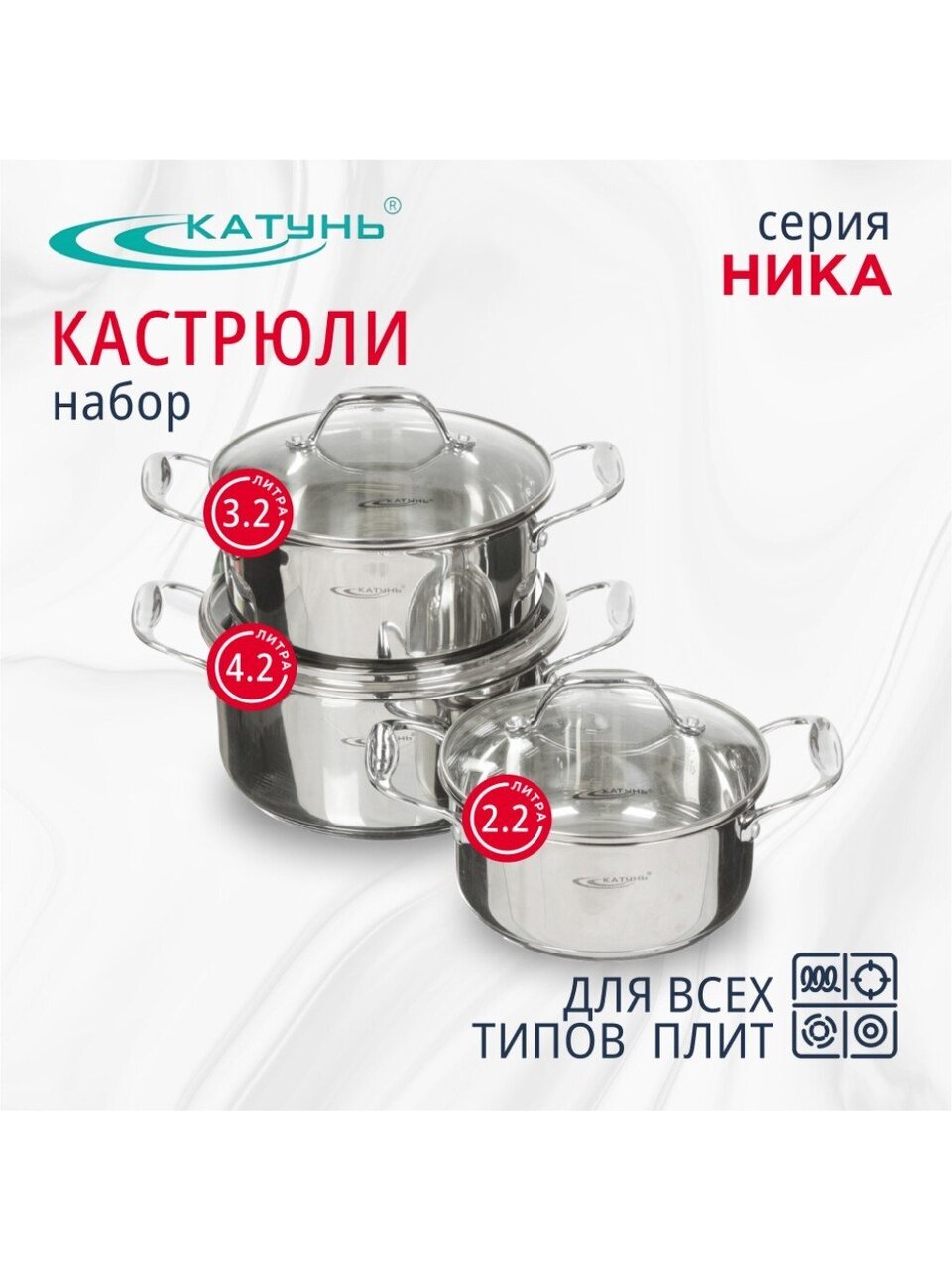 Набор посуды из нержавеющей стали Катунь Ника 6 предметов: универсальное решение для кухни и дачи — оптимальный объём, подходит для всех плит, выгодная покупка.