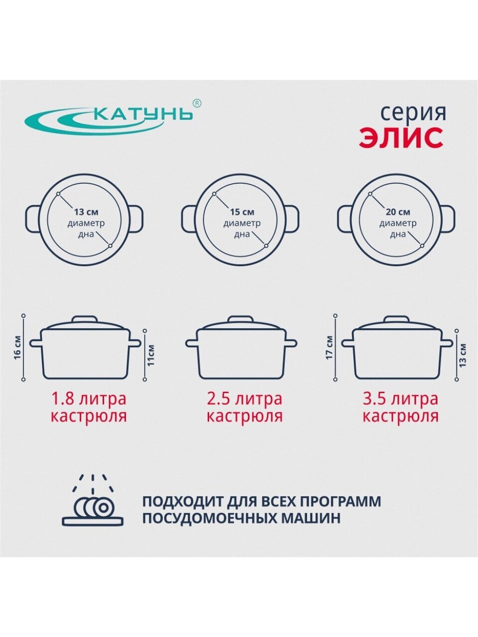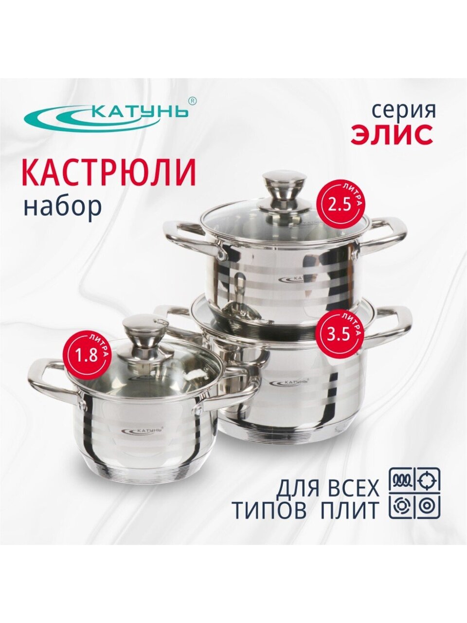Какой набор кастрюль выбрать для индукционной плиты? Катунь Элис КТ16-В — это 6 предметов из высококачественной нержавеющей стали, совместимых с газовыми, электрическими, стеклокерамическими и индукционными плитами. Набор включает кастрюли на 1,8, 2,5 и 3,5 литра, каждая с термостойкой стеклянной крышкой. Серебристый цвет и лаконичный дизайн впишутся в любой интерьер кухни.