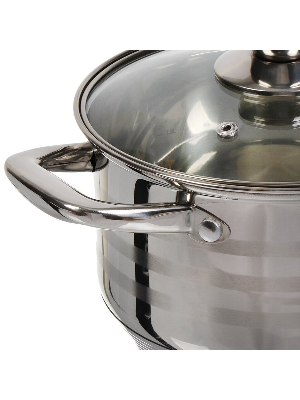 - Практичные объёмы — кастрюли 1,8, 2,5 и 3,5 л из долговечной нержавеющей стали с прочными стеклянными крышками