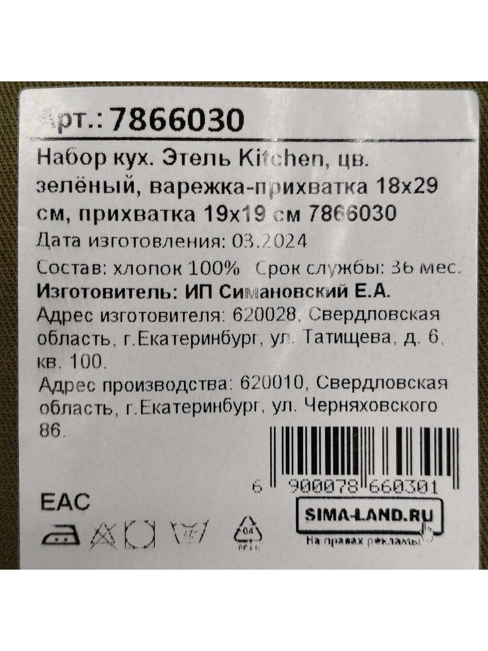 Вы можете приобрести «Набор кухонный 2 шт, 29х18см + 19х19 см (варежка, прихватка), 100% хлопок, саржа, Этель, Kitchen, зеленый» и другие товары в нашем интернет-магазине в Санкт-Петербургe по низким ценам и с бесплатным самовывозом.