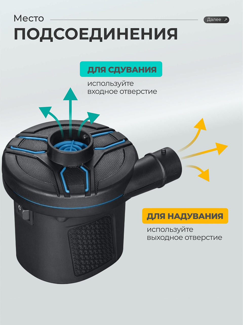 - Оснащен мощным двигателем, который обеспечивает быстрое и эффективное накачивание, сокращая время и усилия, которые Вы тратите на этот процесс.