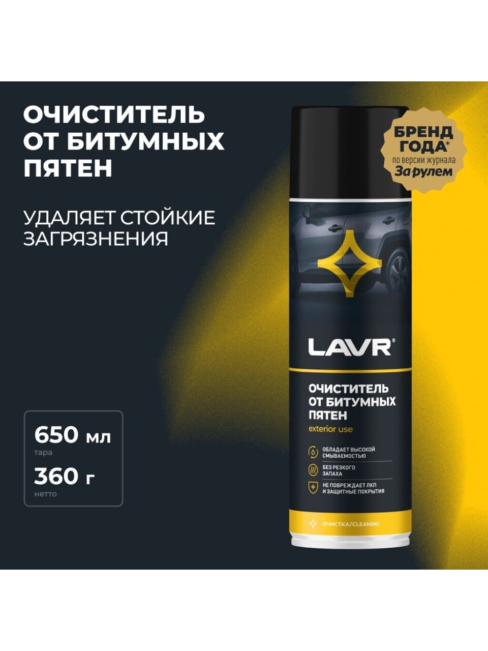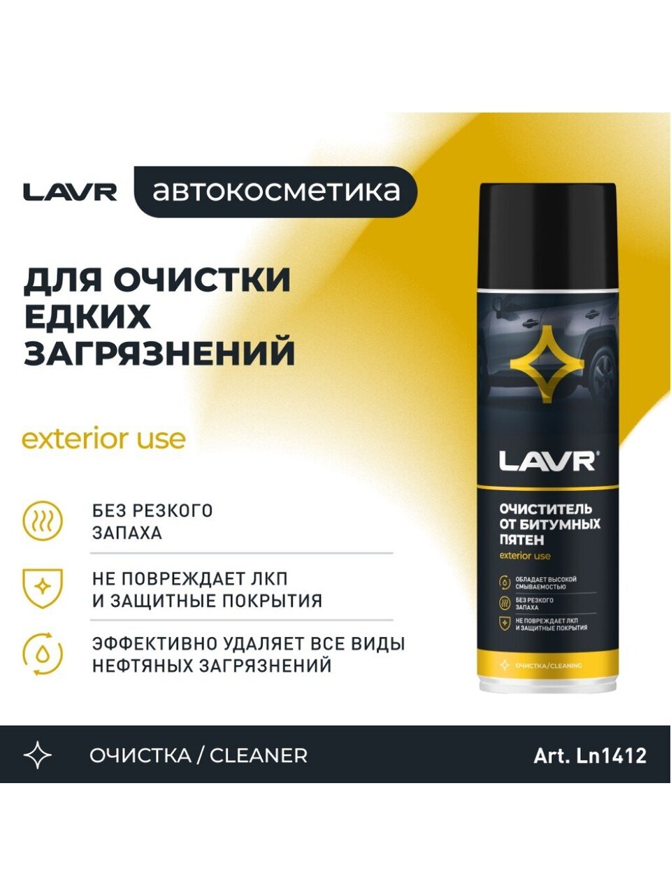 Очиститель битумных пятен Lavr представляет собой высокоэффективное средство для быстрого и безопасного удаления битумных пятен, следов гудрона и других нефтяных загрязнений с кузова автомобиля, колёсных дисков, стёкол и пластиковых элементов.