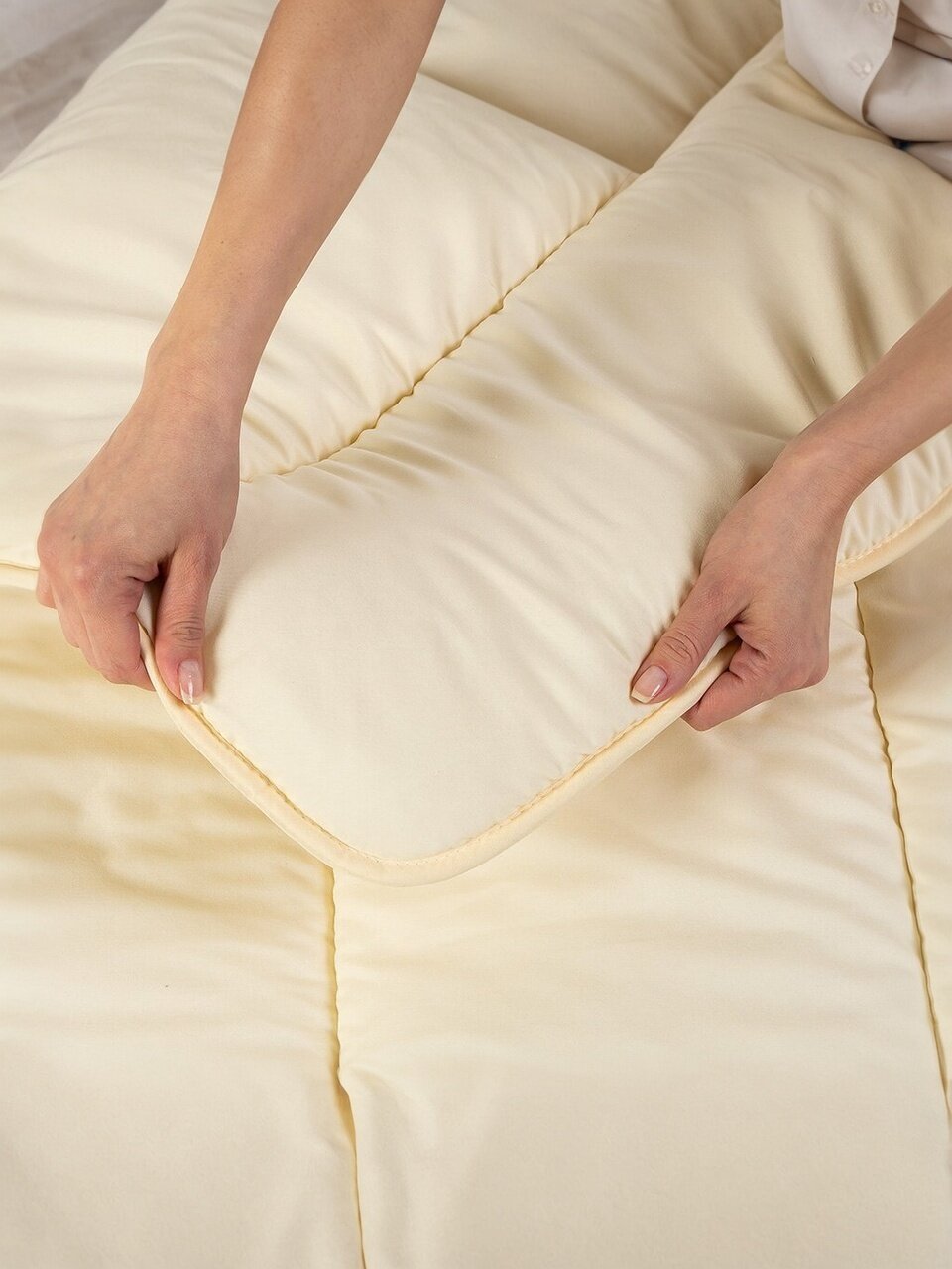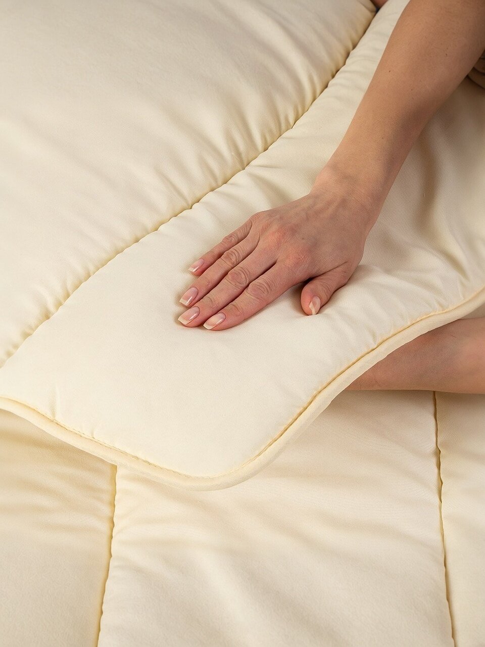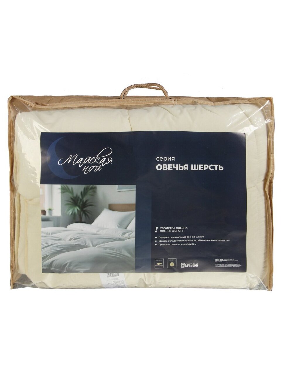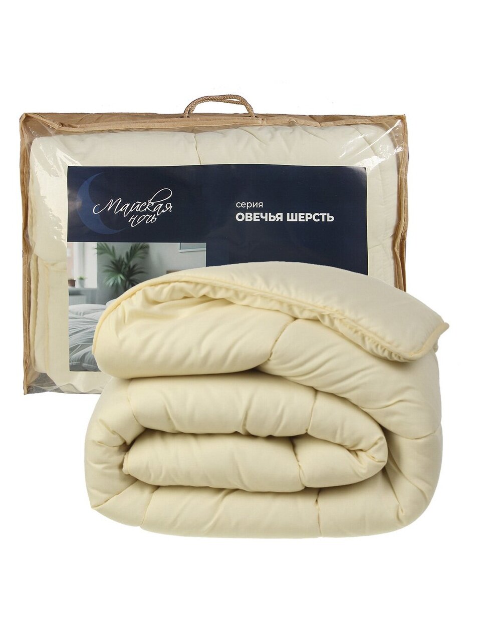 - Натуральный наполнитель — овечья шерсть: сохраняет тепло, дышит, подходит для круглогодичного использования