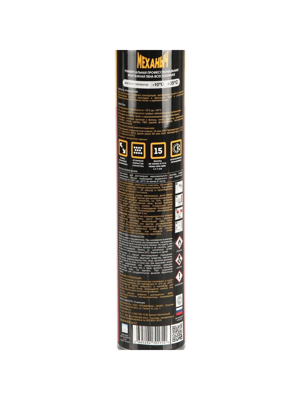 Пена Механыч выпускается в баллоне объёмом 65 литров — этого достаточно для обработки до 40 погонных метров швов стандартной ширины. Время полного высыхания — 24 часа.