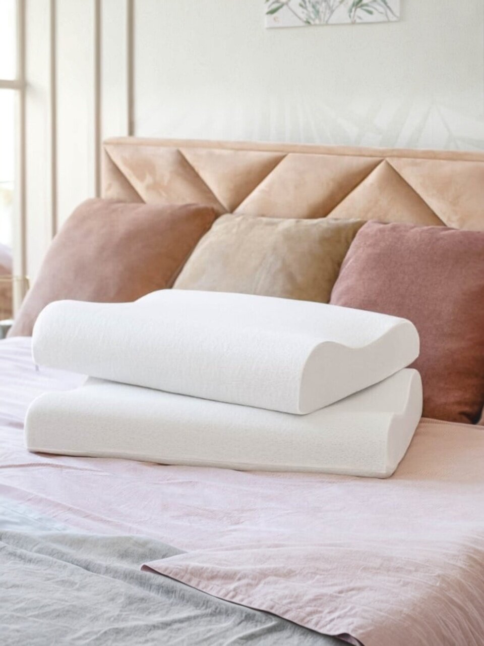 Подушка мягкая, с ортопедическим эффектом и средней высотой — идеально для сна на спине и боку, снижает нагрузку на шею и плечи.