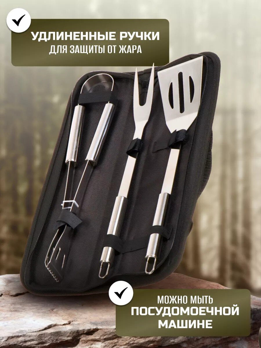 Набор для барбекю сделает ваш отдых на природе более комфортным: благодаря длинным ручкам вы сможете безопасно обращаться с продуктами на огне, избегая ожогов. Компактный чехол удобно разместится в кухонном шкафу или в багажнике вашего автомобиля.