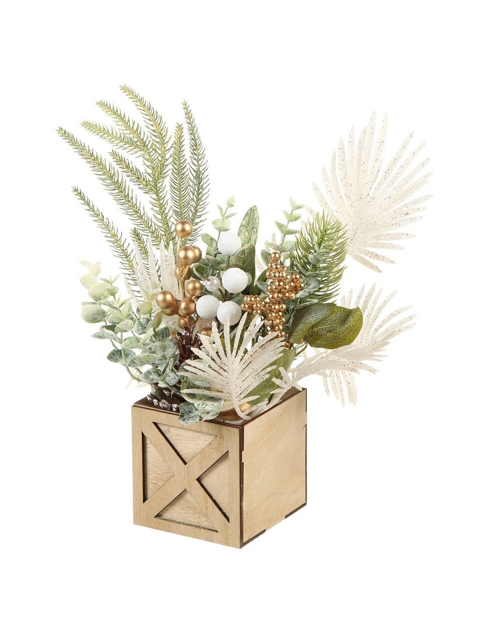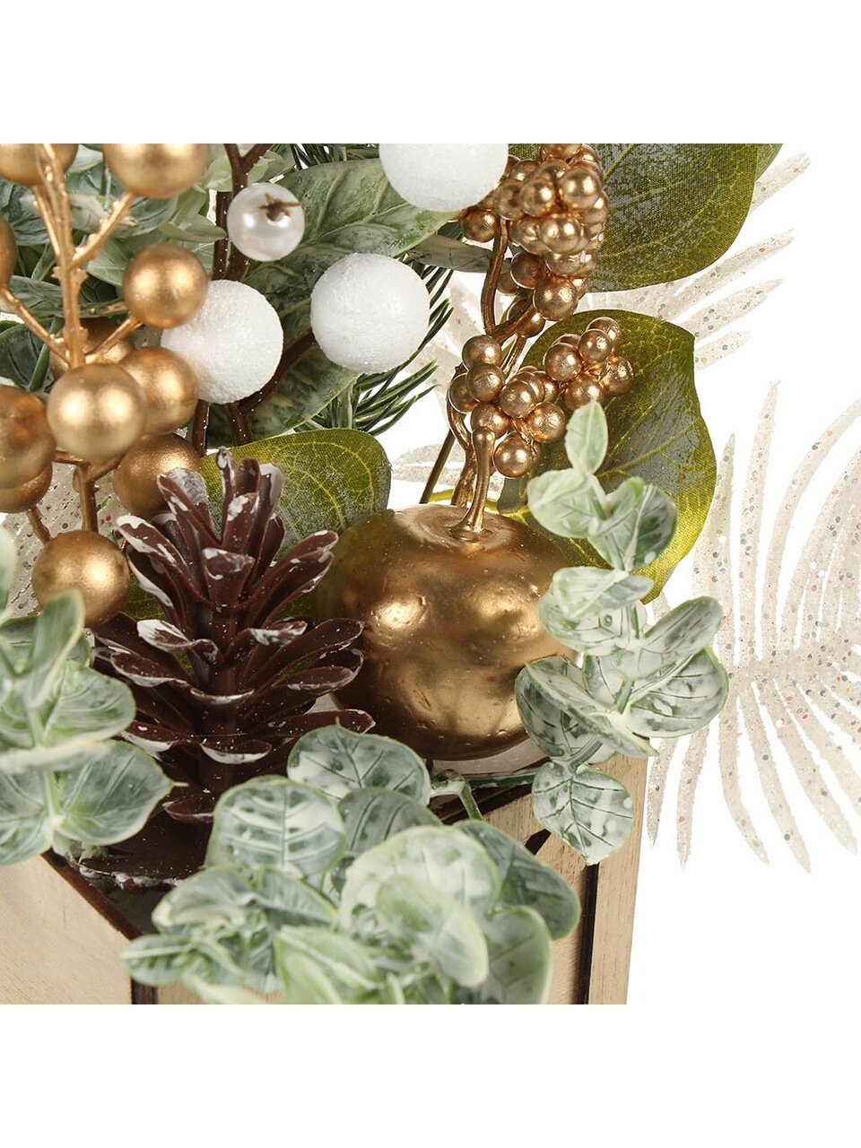 Новогодняя композиция высотой 33 см выполнена в стильном деревянном кашпо, что делает ее не только красивой, но и практичной. Это украшение станет отличным акцентом на праздничном столе или полке, добавляя изюминку в общий декор вашего дома. Композиция создана с вниманием к деталям, чтобы подчеркнуть уникальность и элегантность новогоднего оформления.