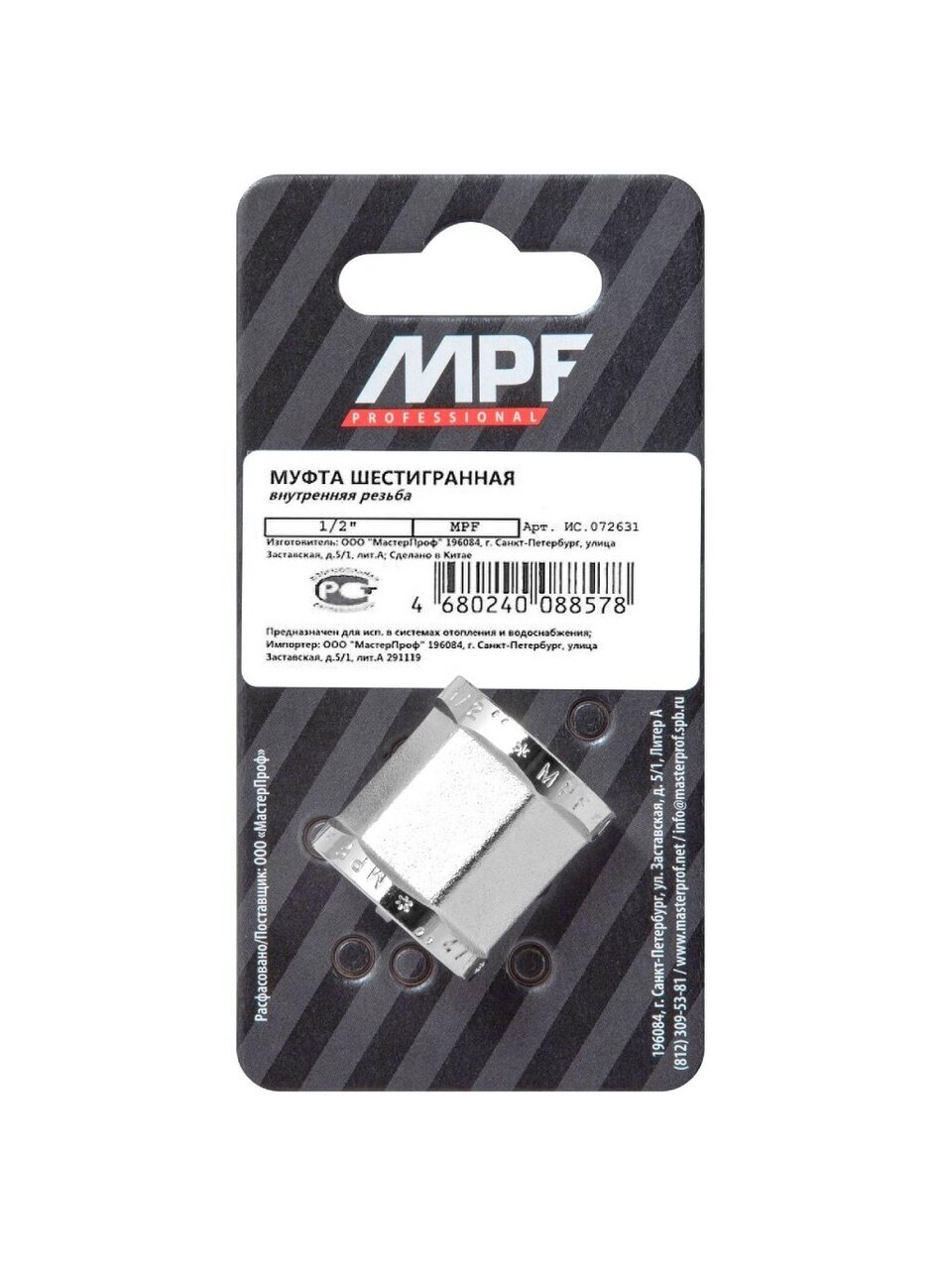 Муфта 1/2'' MasterProf — надёжное соединение для водоснабжения и отопления: латунь, шестигранник, индивидуальная упаковка, быстрая установка без протечек.