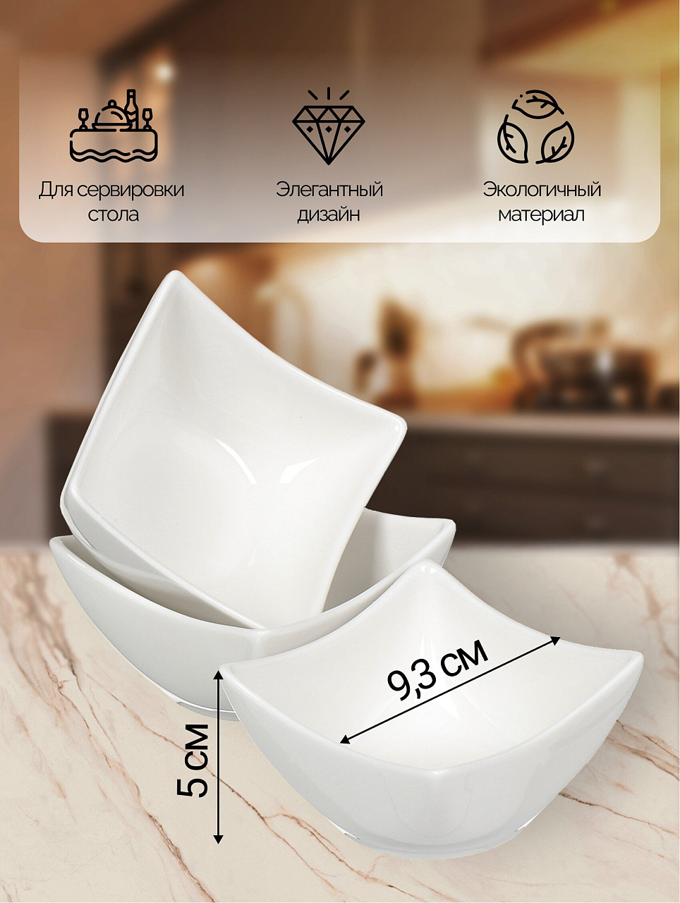 Салатники керамические квадратные 3 шт. 9.3х5 см — стильный набор для сервировки, который решает вопрос удобства и эстетики на вашей кухне.