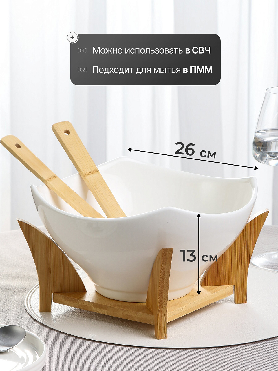 Салатник керамика квадратный 26х13 см, 2.85 л, 4 предмета, на бамбуковой подставке — стильное решение для сервировки и хранения, которое подчеркнёт ваш вкус и упростит быт.