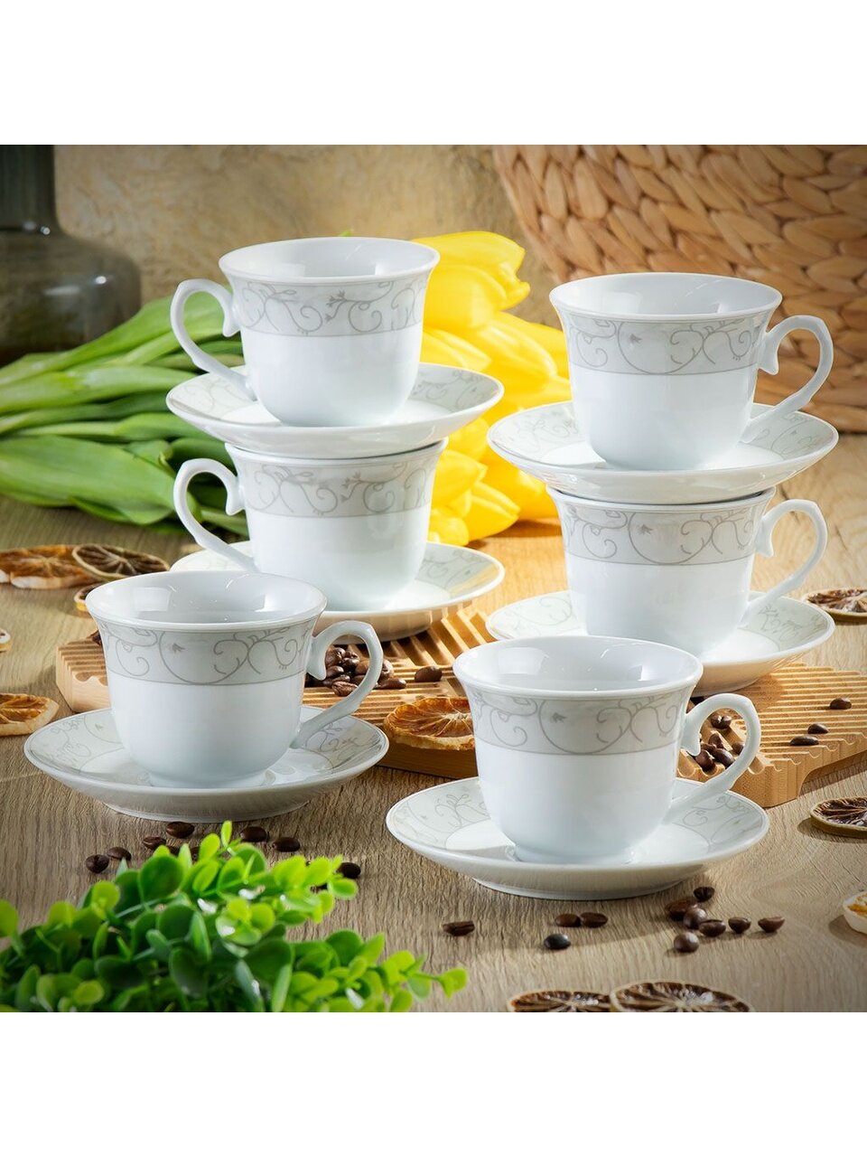 - Уникальный дизайн с орнаментом: каждый предмет украшен классическим узором, что делает сервиз заметным акцентом интерьера.
