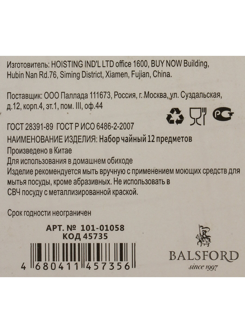 Вы можете приобрести «Набор чайный фарфор, 12 предметов, на 6 персон, 240 мл, Balsford, Фьюжн, 101-01058, подарочная упаковка» и другие товары в нашем интернет-магазине в Смоленске по низким ценам и с бесплатным самовывозом.