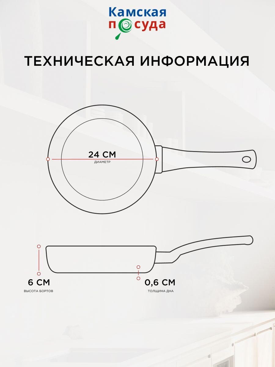 Диаметр — 24 см, диаметр дна — 18 см, высота борта — 60 мм, толщина стенок — 3,5 мм, вес — 2,75 кг. Оптимально для семьи из 2-4 человек.